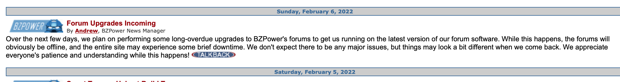 Bzpower forums are technically back but this error is everywhere if you click on anything.
