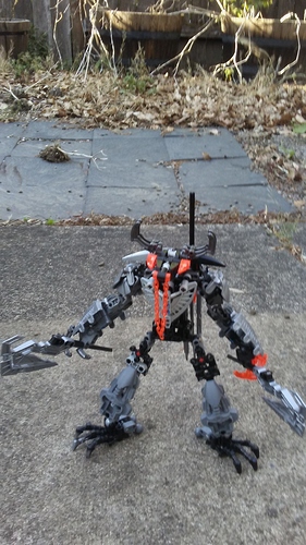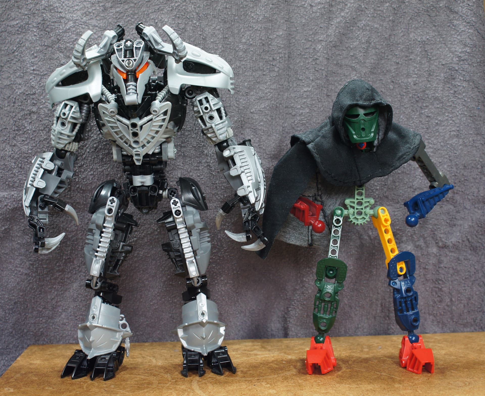 I am quite pleased with how he turned out. Especially the torso – you might be able to tell from the side picture above, but the Hordika armor a this angle just fits perfectly with the two Mantax shells. That’s a really satisfying build. For the head, I originally was actually planning to do something more mask-like, but somehow I ended up with this pretty much immediately. And… it looks good and matches the original. Will probably stick out a bit between my other Makuta, though… then again, they are shapeshifters.