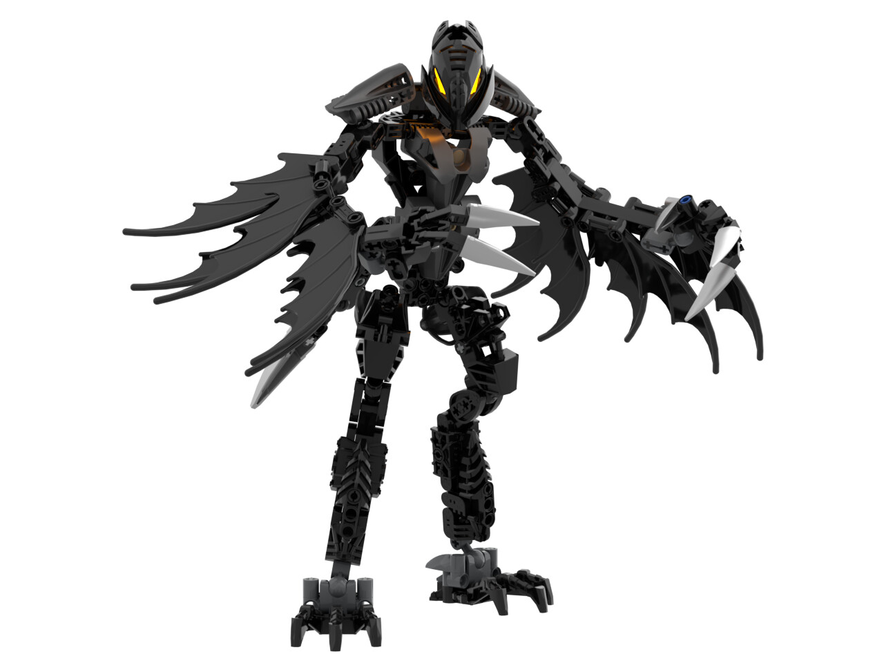 I like how you preserved the lanky aspects of Darkness’s original model. I do feel that he looks a little too like a Makuta, who shared that bat-like influence, as well as the same mask and upper back torso piece. Also, I feel like he’s lost the uniqueness of the extra arms. Still, I do quite like the construction. The lower legs look really good, and the Slizer heads add a lot as shoulder armor. Plus, the arms are very well-made. The yellow eyes do provide a good distinction from Makuta that I like (in contrast to the other similarities) and the hands are impressive.
