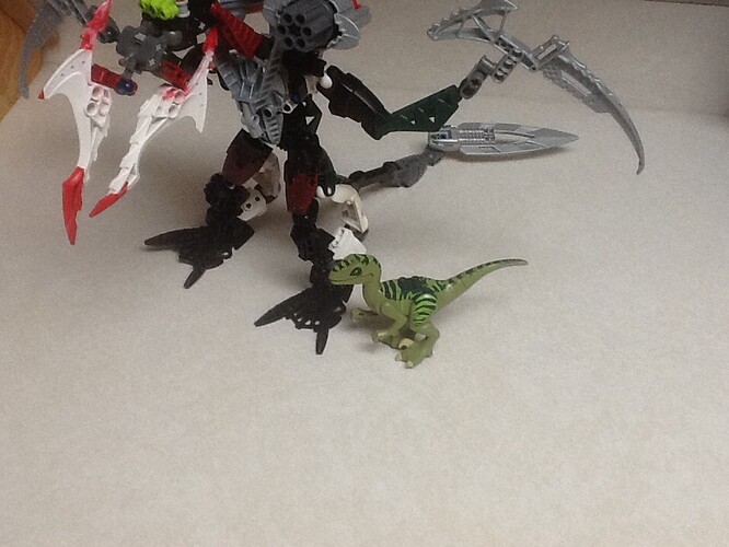 A Robotic combination of a pterodactyl and a praying mantis… WITH GUNS! But, anyways I apologize for some parts that are not properly colored to match but I tried my best. the raptor is for size comparison only. green is the mantis parts, light blue is the pterodactyl, dark blue is the Guns.