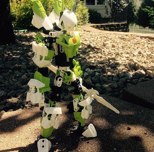 I like the color scheme, not something you see often. The head looks neat, especially with that green piece in the eye. (By the way, what piece is that?) Only thing I don’t like is the stud (or at least I think it’s a stud? Sorry if I got that wrong.) in the chest, I don’t think it goes well with the color scheme. I myself think a light blue or a red one would look better. But overall, I quite like this! He looks awesome.