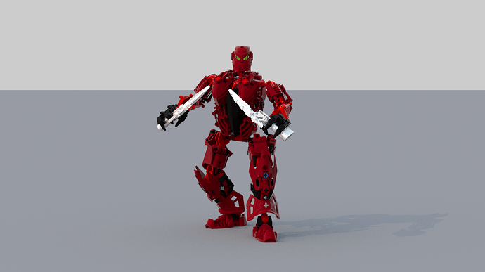 I made this MOC because I wanted to recreate a friend of mine in a BIONICLE style. She likes the Fire Elemental power, likely because her favorite colors are red and black (I never asked for the real reason why, now that I think about it…), which is why this is a female Toa of Fire MOC with a red and black color scheme. I tried my best to actually recreate my friend’s body in as accurate a manner as I could in LDD, but I feel like it still is a little off. I feel I could have made a better torso if LDD had all on Generation 1’s parts, but unfortunately for me, it does not.