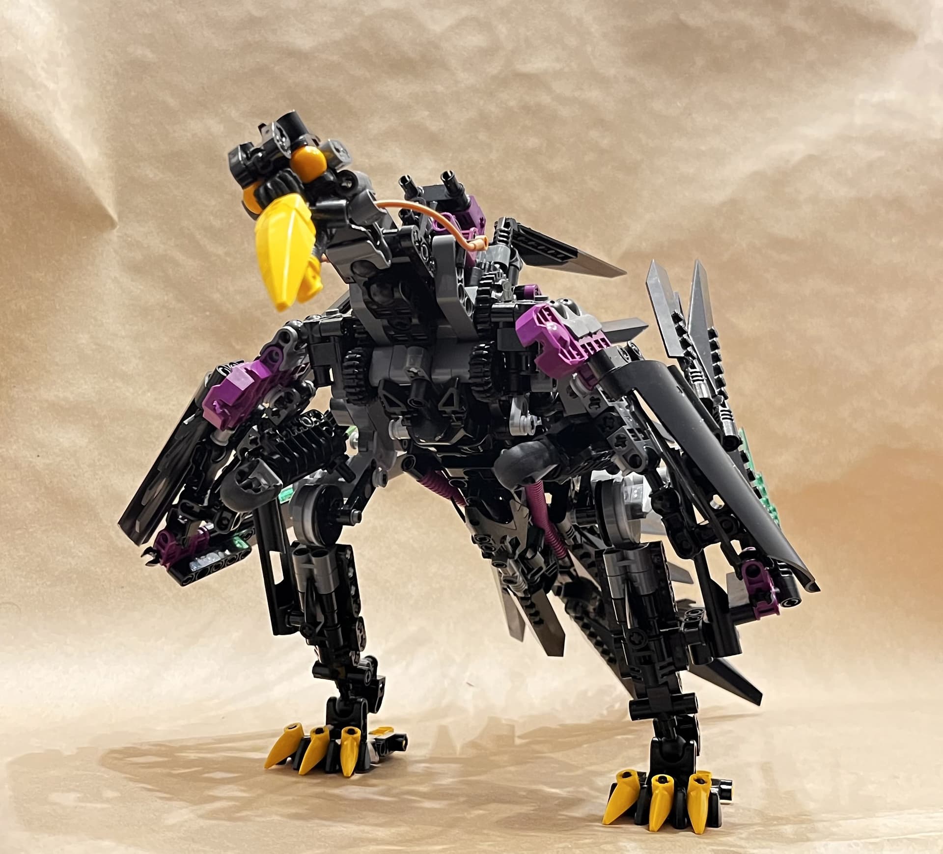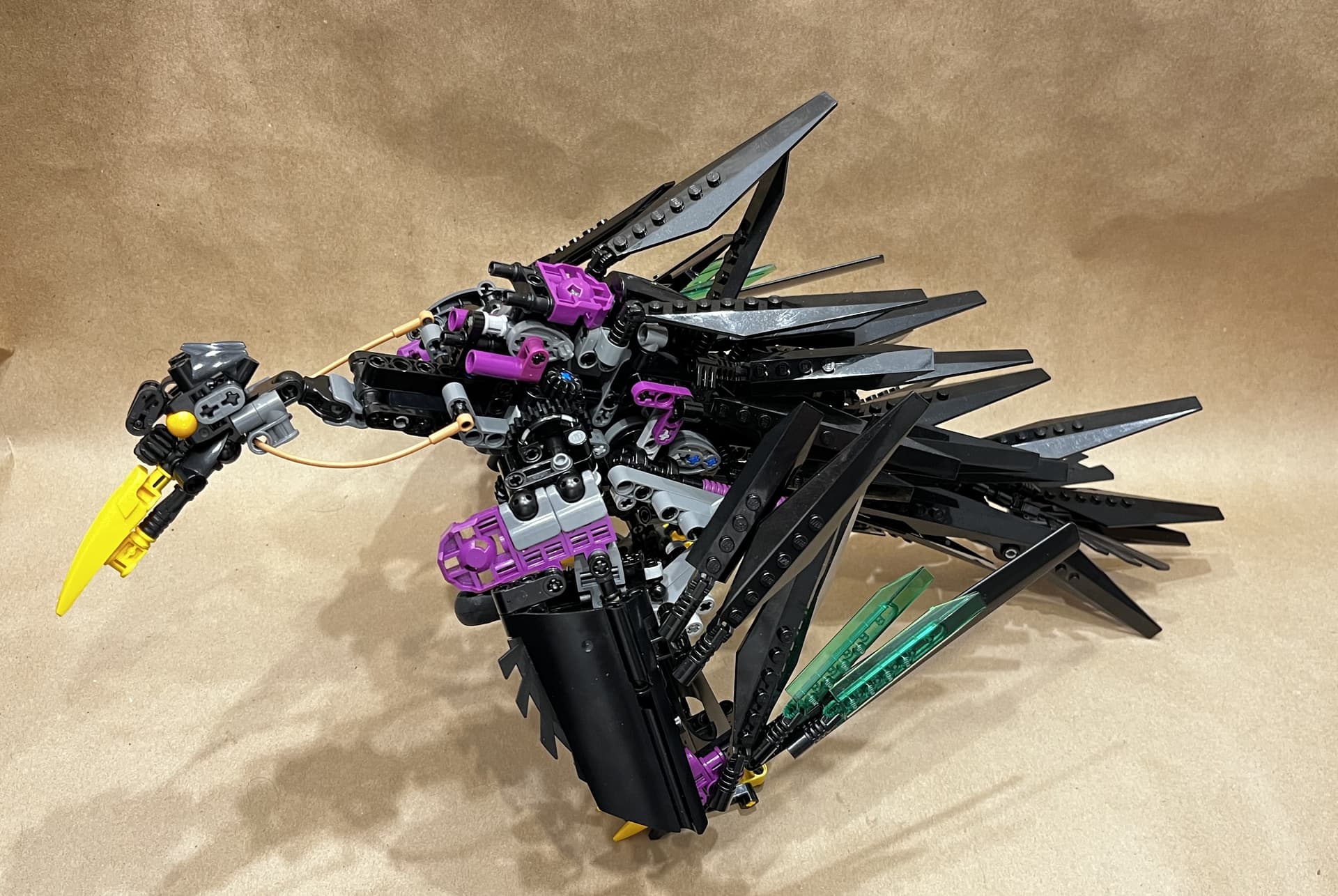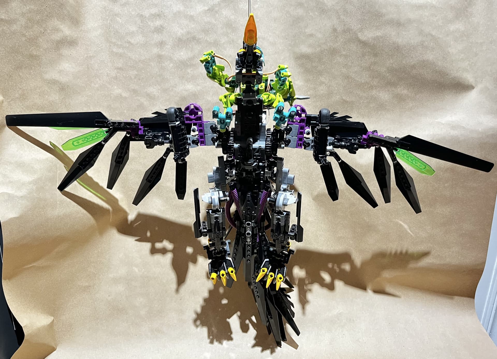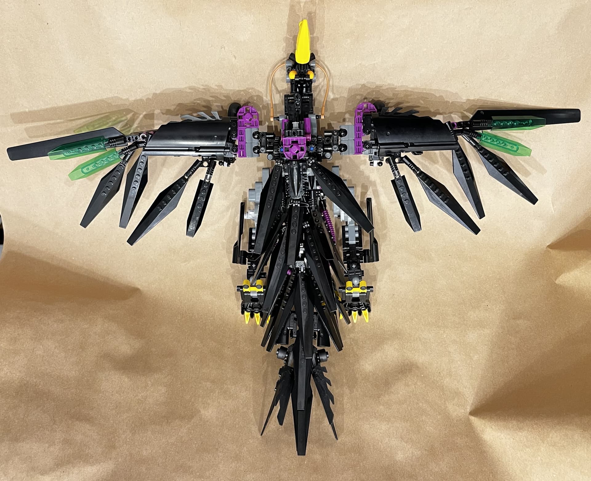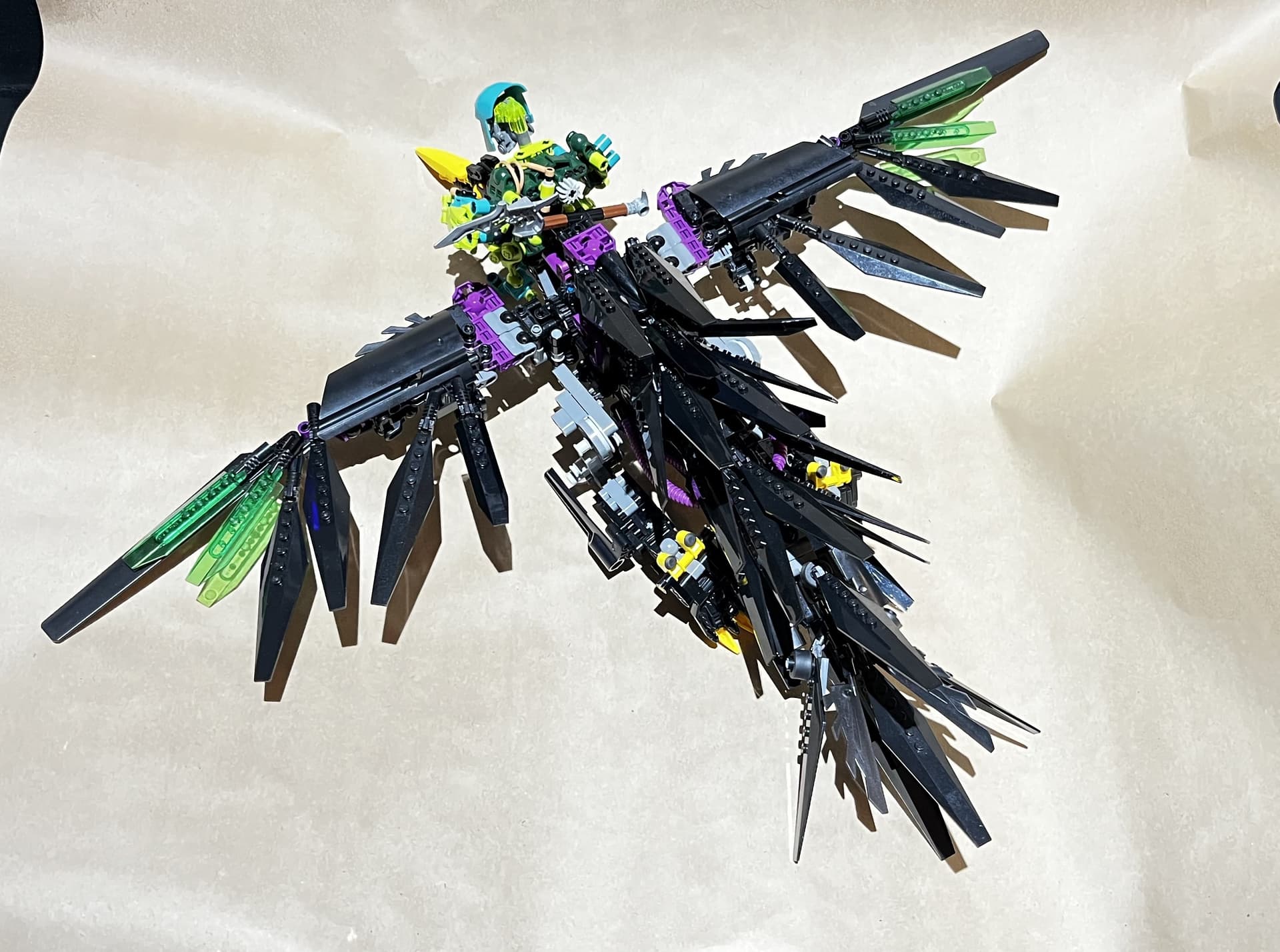 Hi everyone! This is my take on the temporarily non-canon hawk-like Rahi, the powerful Kahu. Memorably featured in the MNOG, the Kahu was also introduced as the alternate build of the original Nui-Jaga set, though notably the MNOG Kahu featured several color variations from the physical set. I took inspiration from both sources, though more heavily focused on the aspects from the MNOG, such as the yellow talons and beak, translucent green highlights on the wings, and more heavily featured black color scheme. A few years ago, I got a bulk amount of diamond hinge pieces for something like $0.50, and haven’t been sure how to use them. Well, I finally found a use for them in giving this Kahu a feathered look. I was also slightly inspired by how the Native Americans would depict avian creatures, especially the mythical Thunderbird.