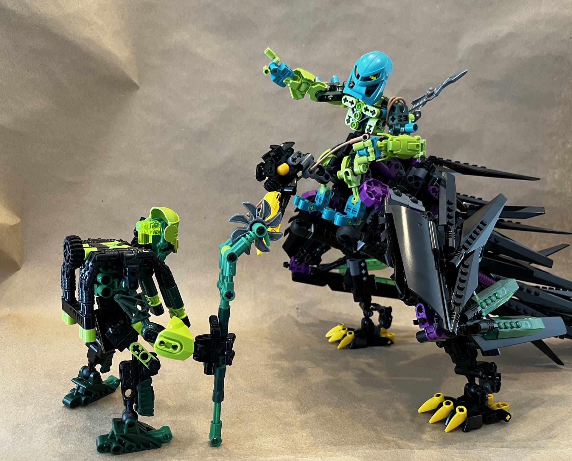 Kongu of course features here, as the brave Le-Matoran and leader of the Gukko Bird Force skillfully rode his Kahu into battle during the 2001 story. This design has gear-operated wings, allowing for more posing and strong stability. I used a lot of classic purple, which works very well with the black and various grey shades featured in the model. Hope you like it!