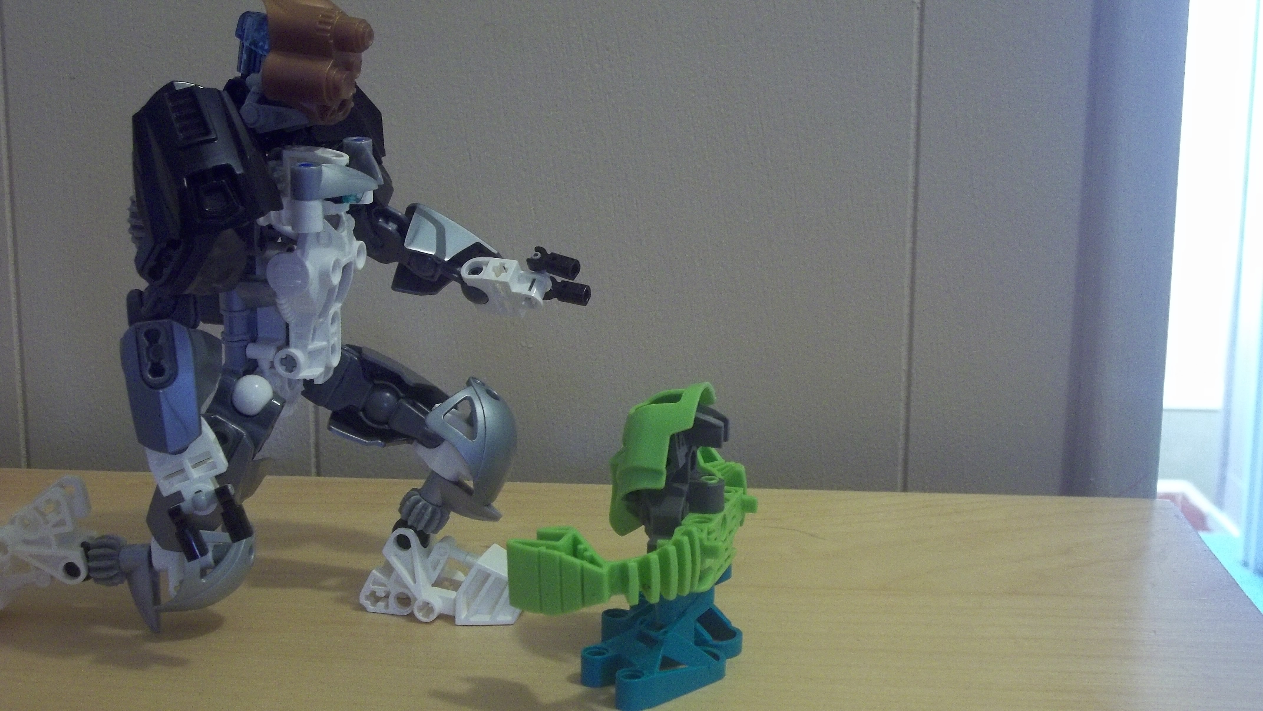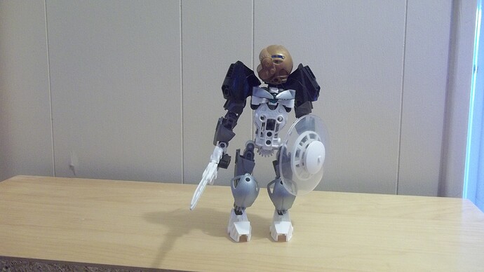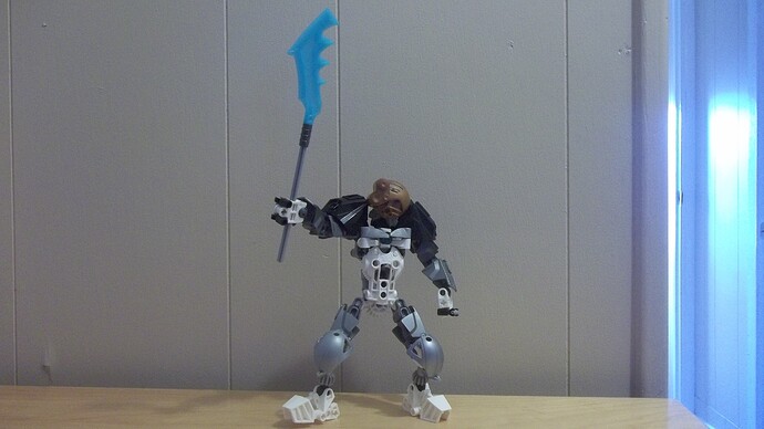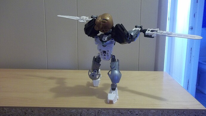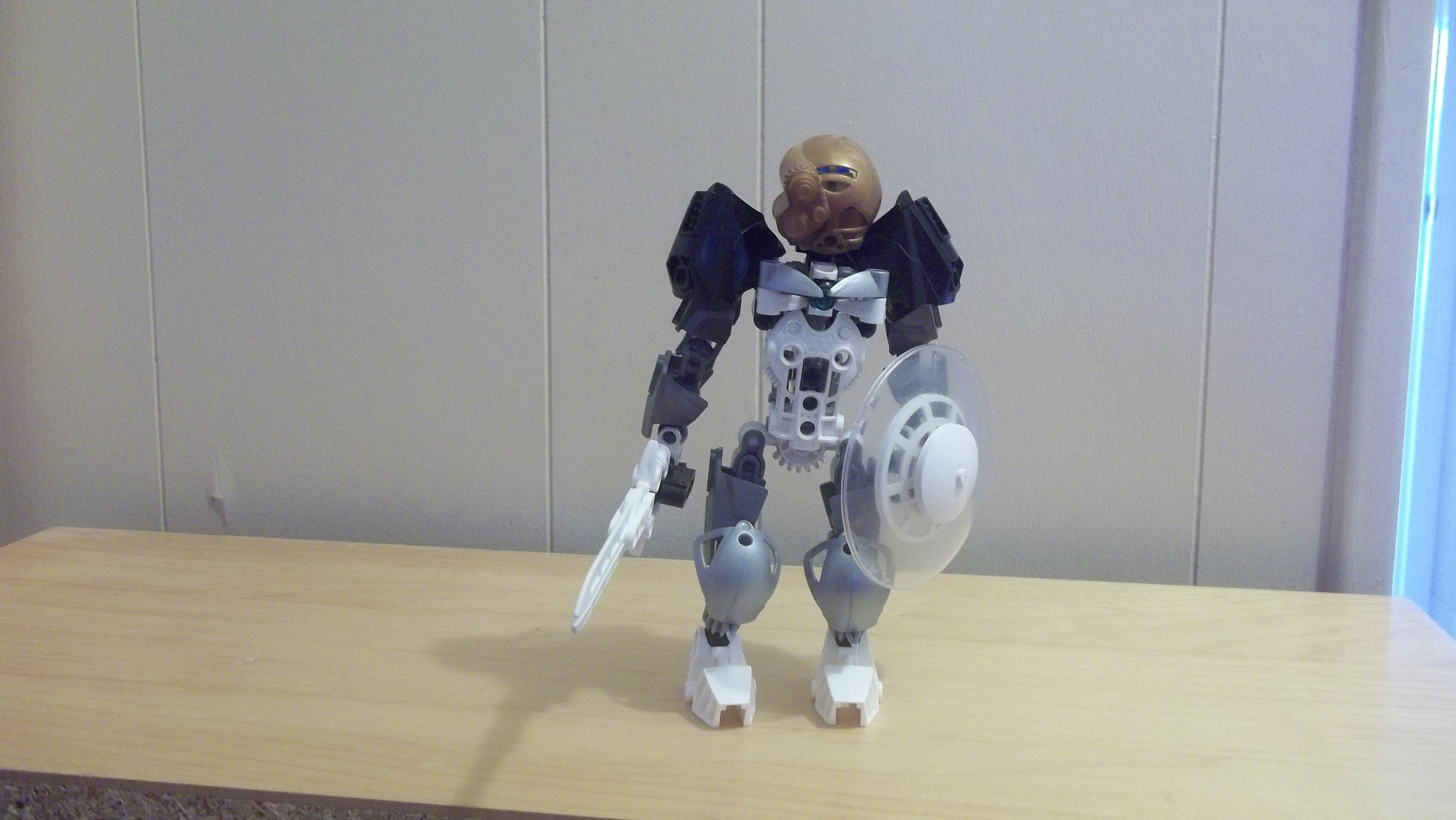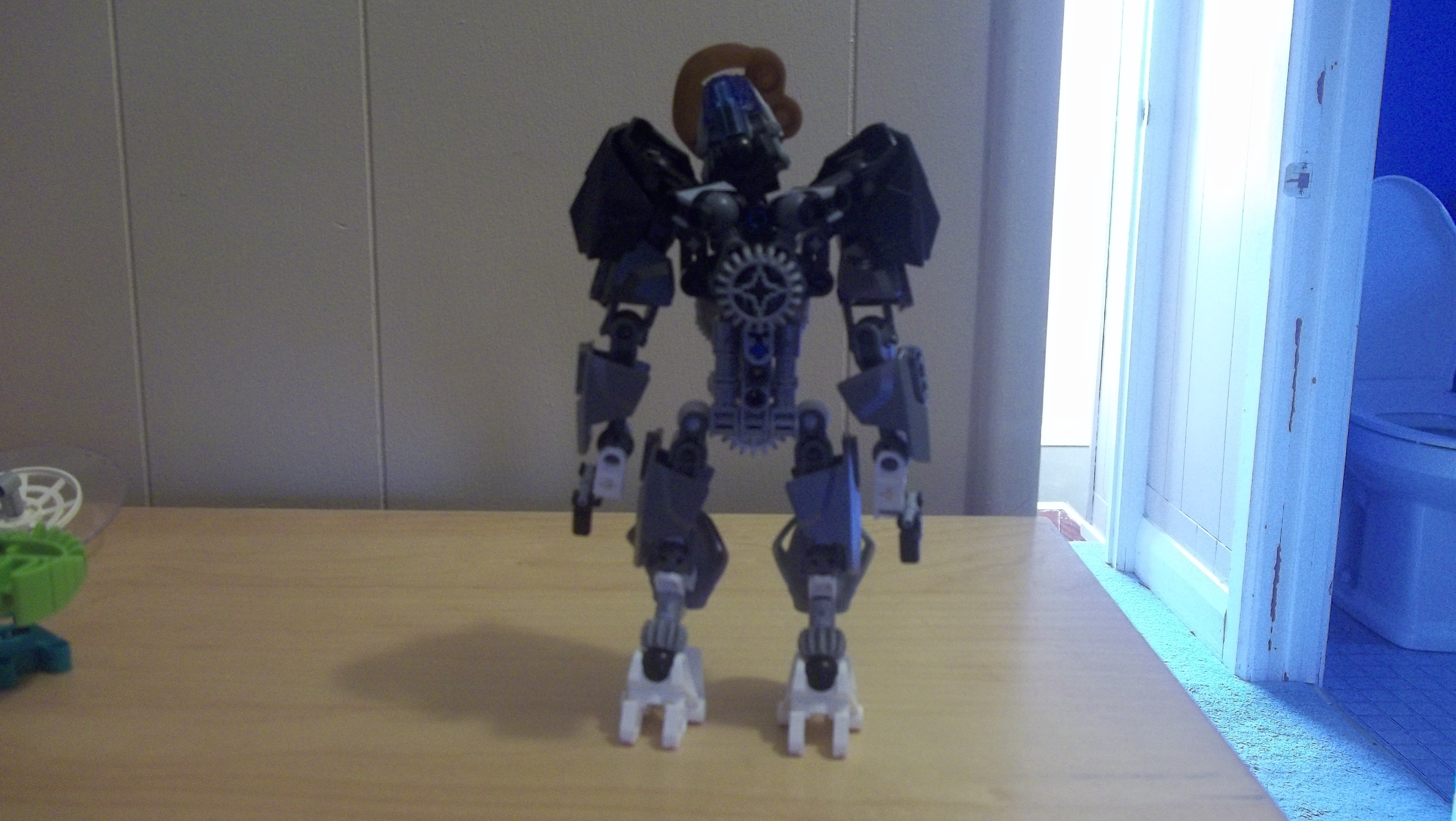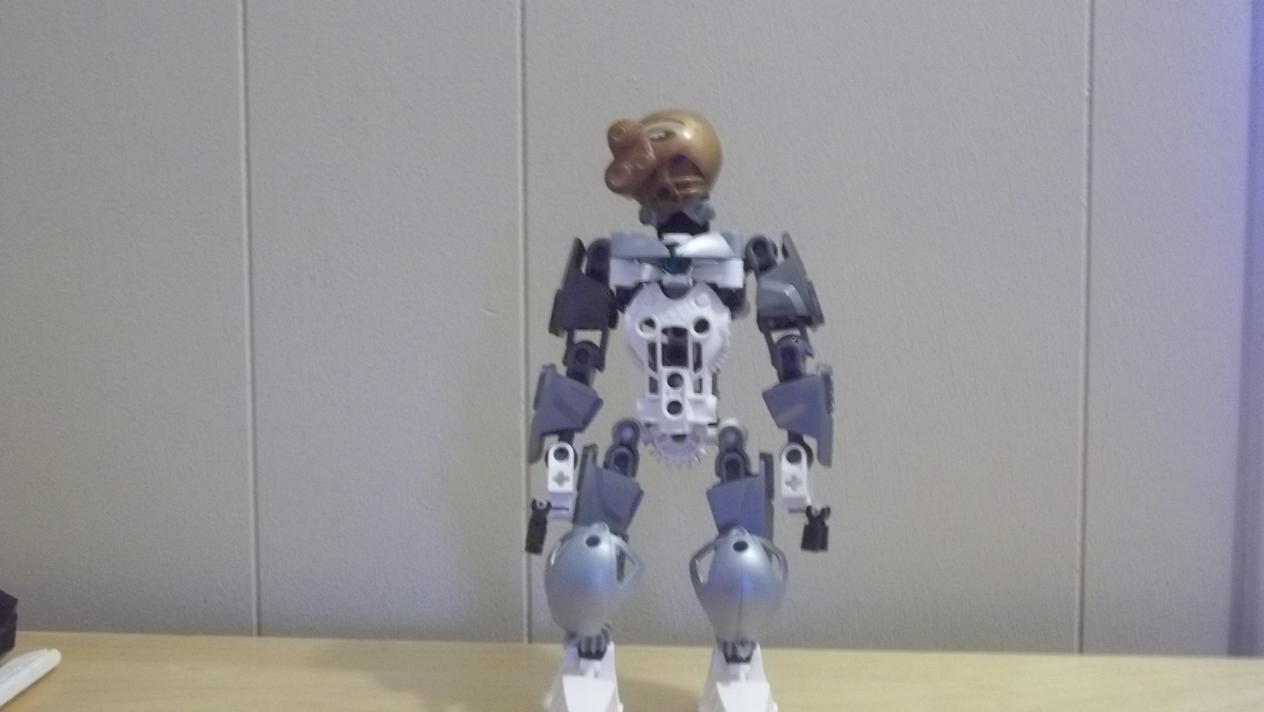 I like the design, but it feels a bit off here and there, especially on the upper chest (the bohrok eyes seem out of place) and the knees (the nuva shoulders just look odd when he stands up straight). Other than that, the rest of the design is great. I definitely think black and silver work better in his color scheme than gold.