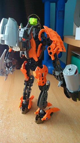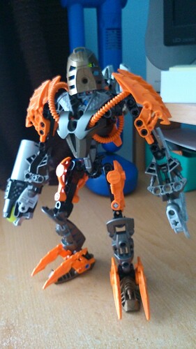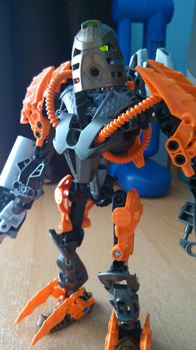 This is a pretty cool MOC. I have to agree with @Risebell, he could use a orange, grey, or silver mask, but I understand you not having the parts available for it. The only problem I have with the MOC is the legs being a little skinny, especially with the bulky body, the feet are fine though. But other than that I think this MOC is pretty awesome, keep up the good work. ![]()