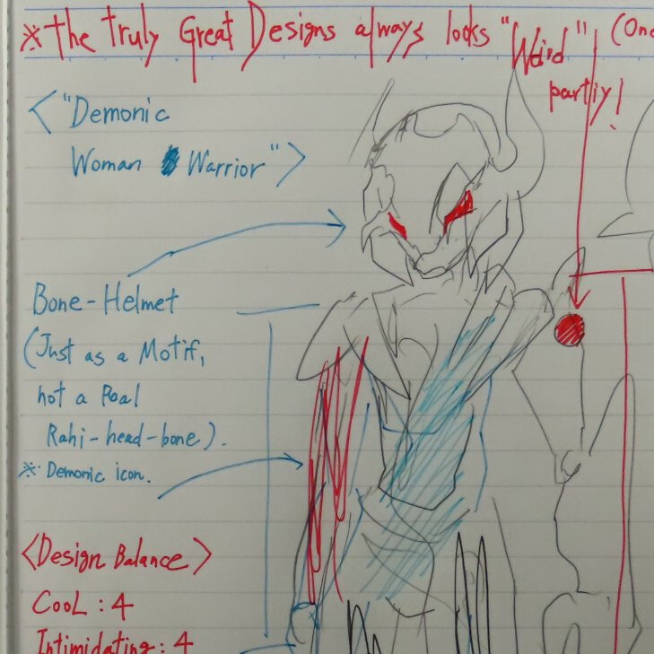 I inspirated by the Official her Quotes(She often says “Rahi bones”, as a abuse, so I thought that If she is a ‘apex predator’, Isn’t the fact that she wears the skull of her victim as a helmet or mask fits her personality?) and decided to her as “Demonic woman”, becaude I felt a “Demonic/Baphomet-like design” from TSO(her boss), and felt to I must design her as “Semi TSO”, as Deputy leader of DH.
