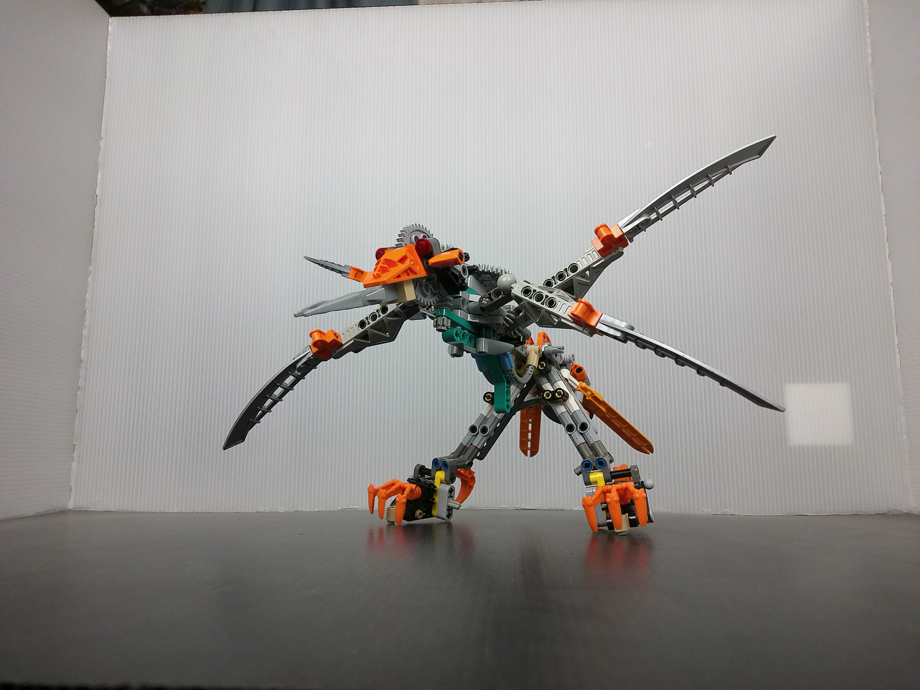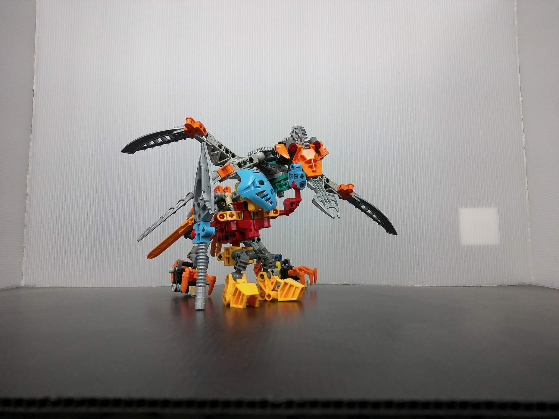 Even down to the head which utilizes a gear to replicate the tufts of feathers along the neck. Not only that but streamlining the wings to not only retain what the OG set did, but doing it better with the use of gears instead of the Technic mess that made it super hunched initially. The biggest mind-scratcher was how would I pull off the handle. The last thing I needed was an Transformers Armada Laserbeak situation. And what I came up with, is probably one of the best ways to make a handle. The legs are able to link together with ease becoming the handle for ultimate swoosh-ability! The Gukko’s head can even turn left and right automatically depending on which way you are turning this majestic creature! You can also of course control the head with an array of gears, or even have Takua turn the head for you if you have a spare pin on hand to link HIS hand to the big gear on the Gukko Bird’s back.