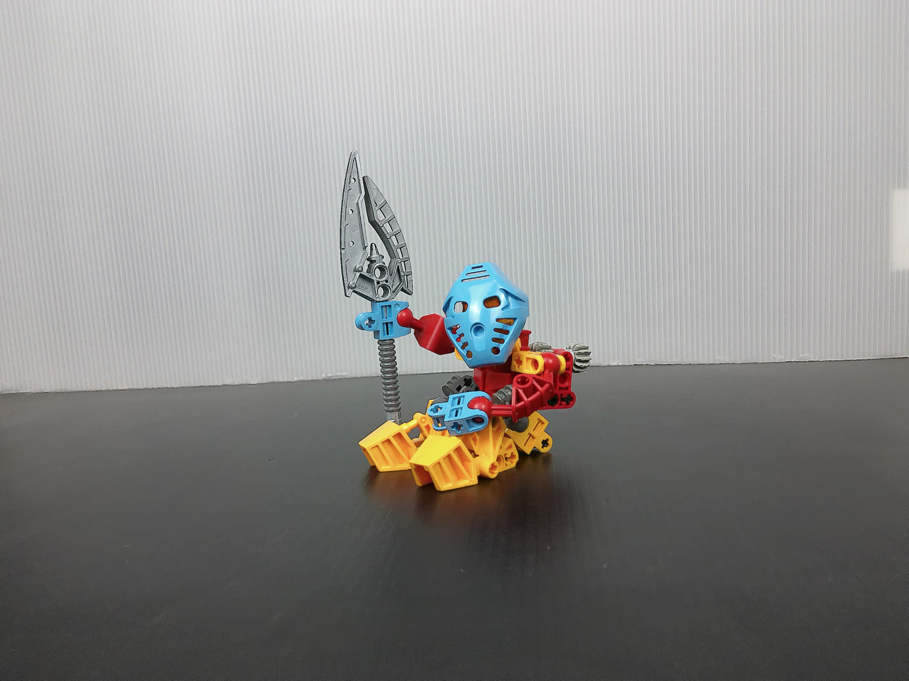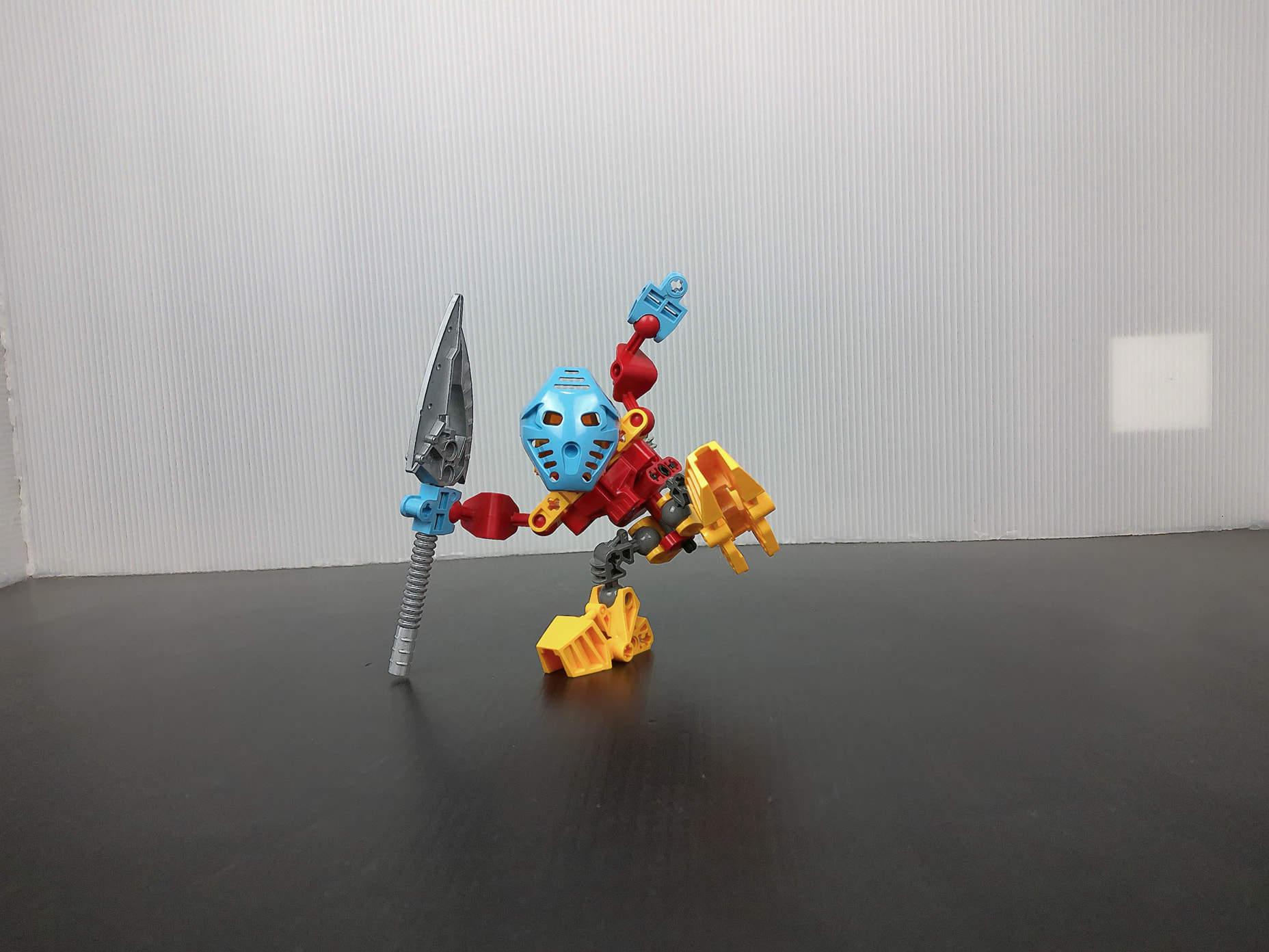As for the whimsical Av Matoran in disguise, I wanted to include more ranges of articulation to an otherwise near perfect design I have done years ago. From using Mata feet to reflect what he might have had back on Karda Nui, to the upside down legs to imitate Gali’s legs, and retaining some light blue in the colorscheme. For that shade of blue feels more like Takua than the Mata Blue in my honest opinion. Furthermore I added an ab crunch into the torso without impeding with the gearbox.