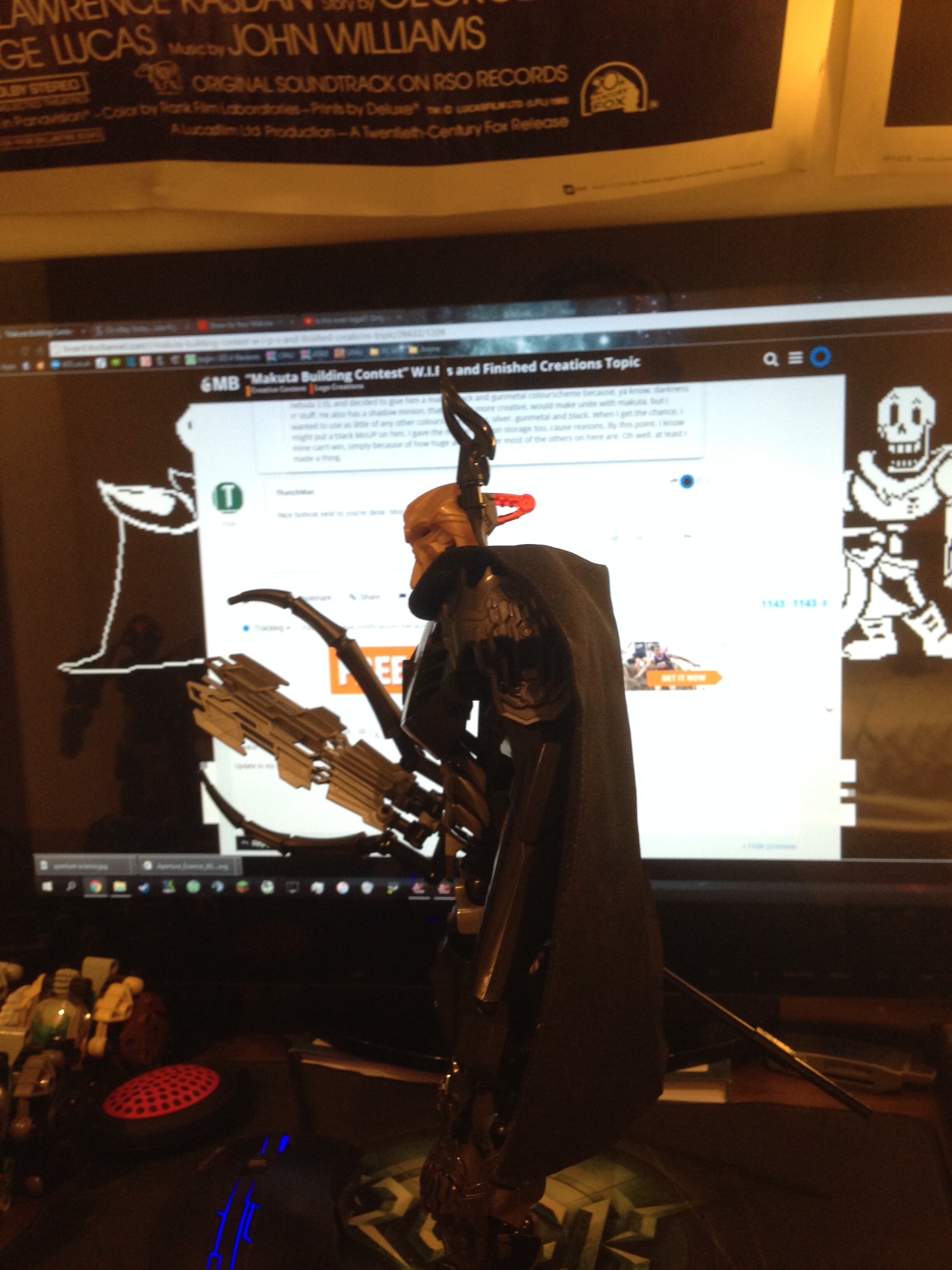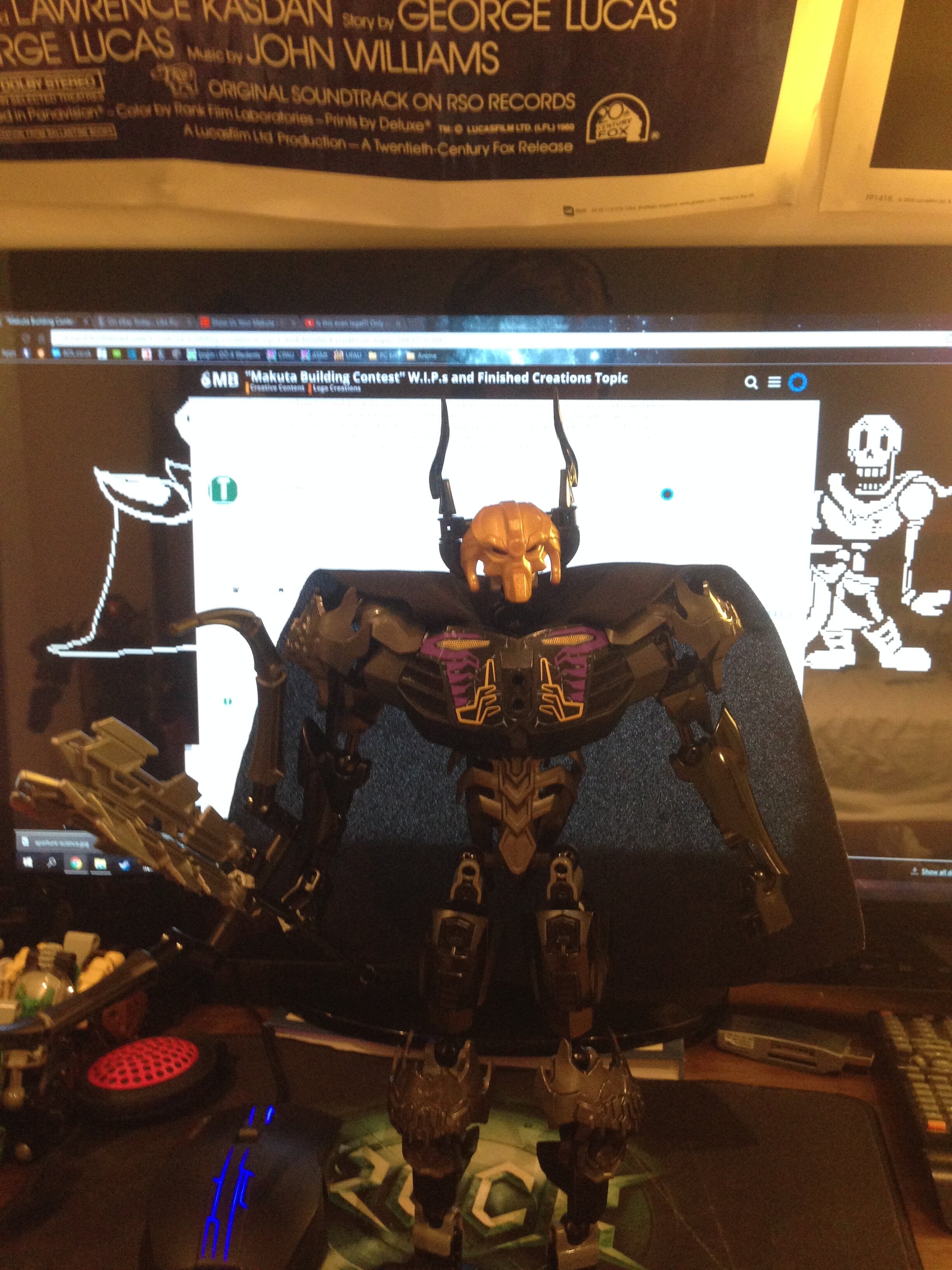 This is my version of Makuta. I gave him a weird staff with spinning claws⌠(Wait, is this makuta or von nebula 2.0), and decided to give him a mainly black and gunmetal colourscheme because, ya know, darkness nâ stuff. He also has a shadow minion, that if I were more creative, would make unite with makuta, but I wanted to use as little of any other colours except grey, silver, gunmetal and black. When I get the chance, I might put a black MoUP on him. I gave the minion weapon storage too, cause reasons. By this point, I know mine canât win, simply because of how huge and far better most of the others on here are. Oh well, at least I made a thing.