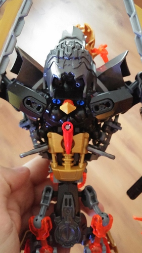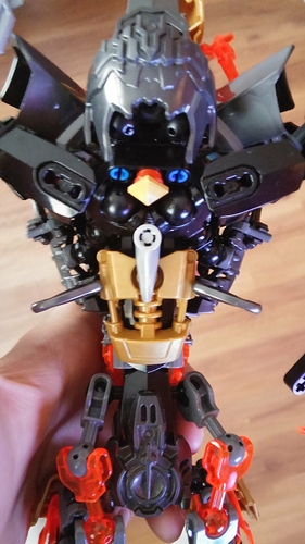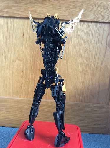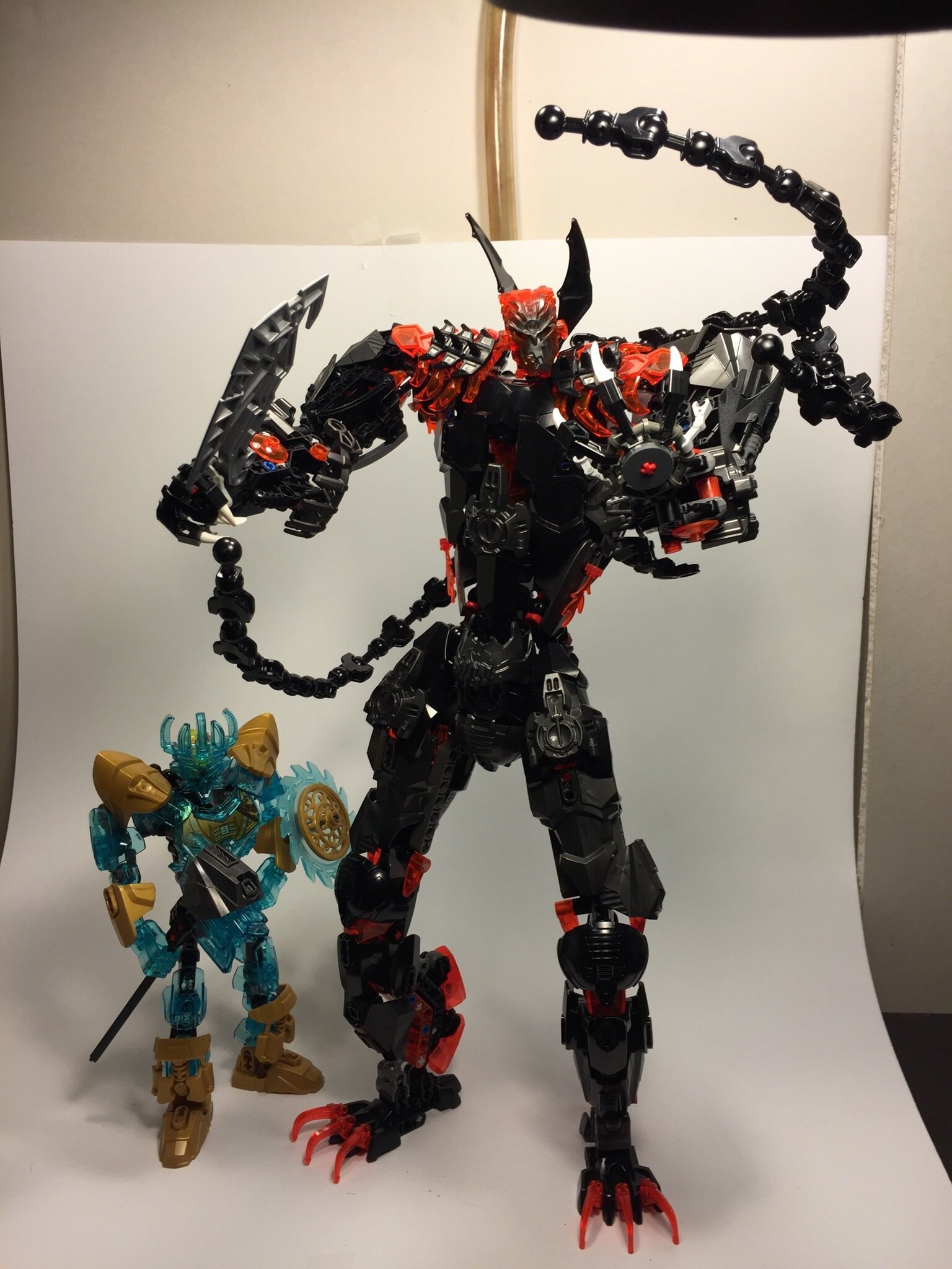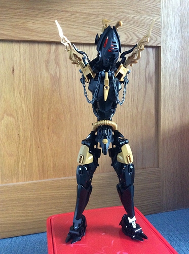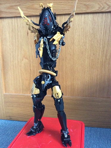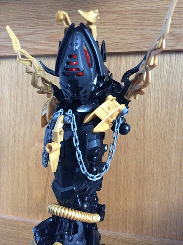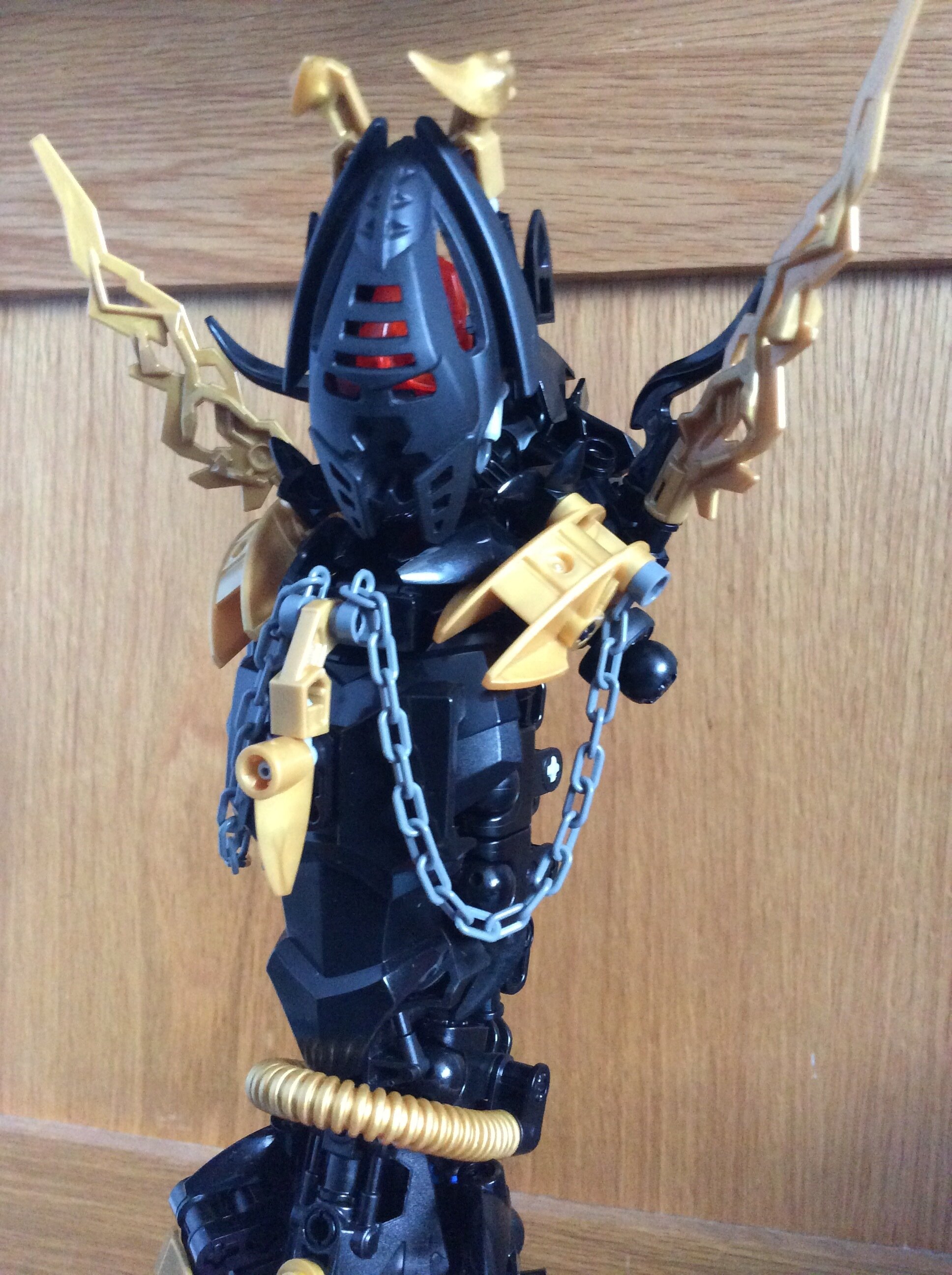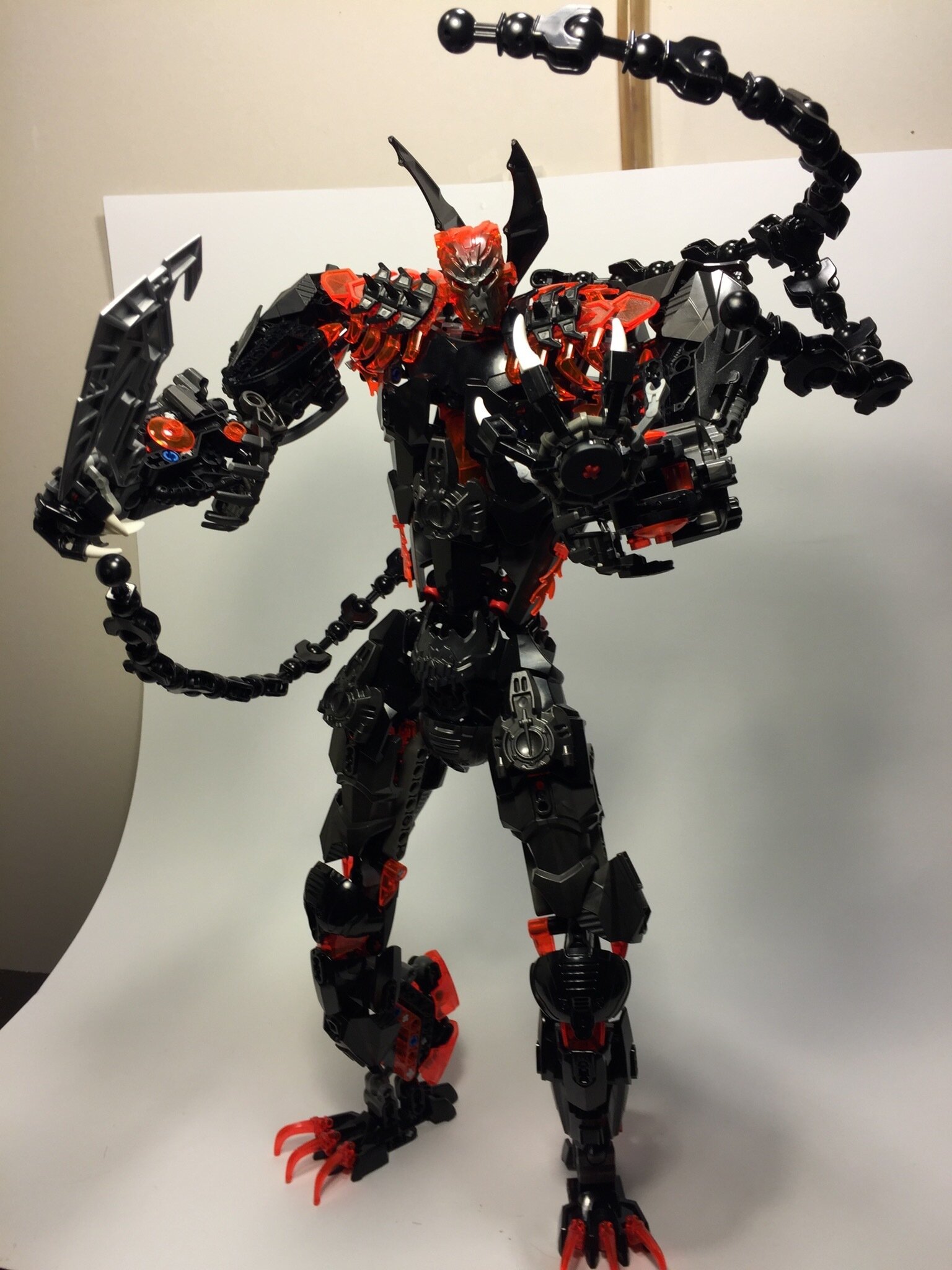 Personally, I think that you should attempt to build a custom head for your moc. While it looks cool, I think that the head is far too small for the body, and making a custom head, perhaps one that integrates the mask you are using. I also think that you could possibly try a staff, similar to teridax’s. I think the arms on the back, while cool, could do with some armour (trans red and black?), could be made shorter, and on the ends, some wings. Other than that, your moc looks awesome dude!