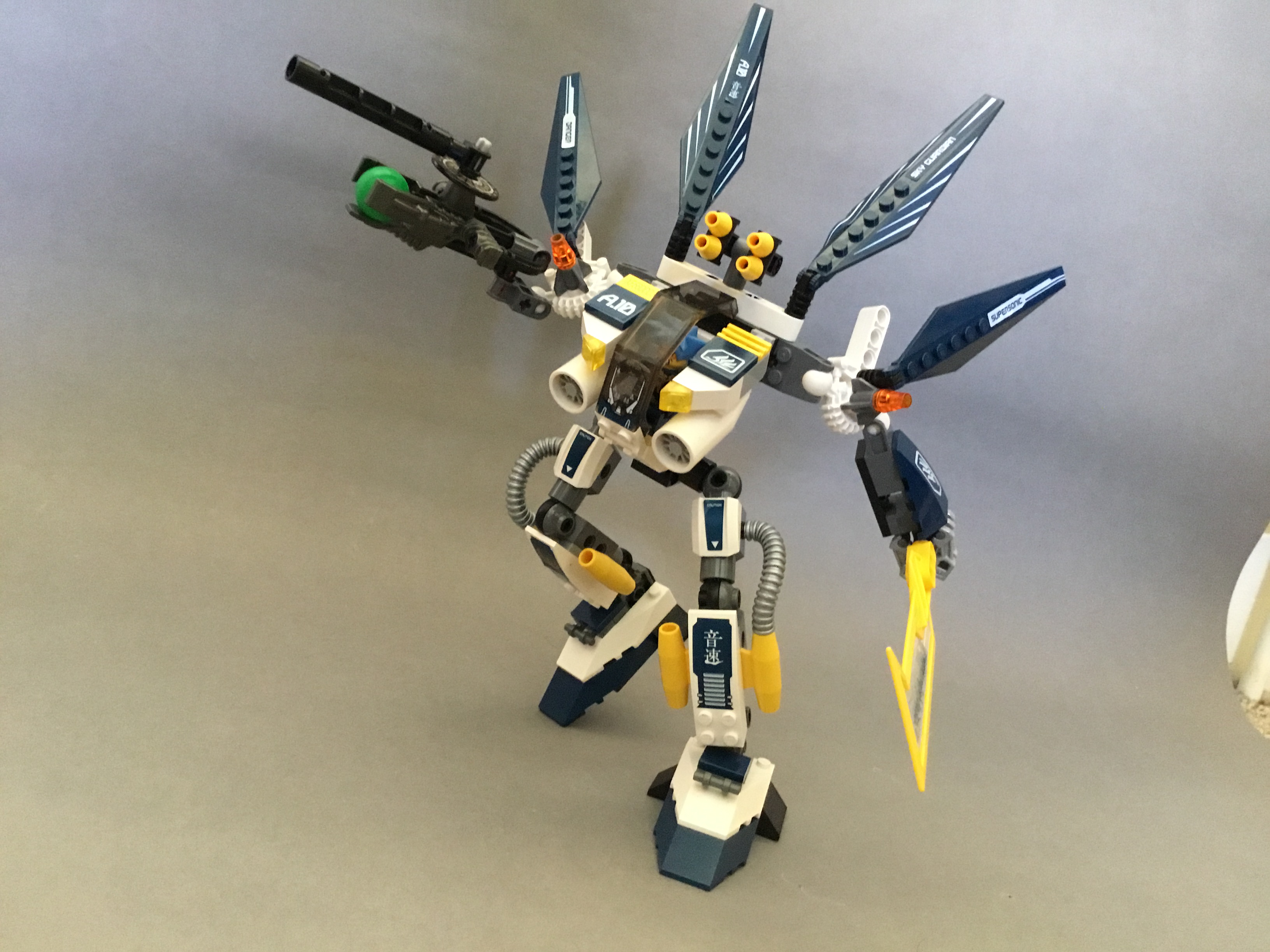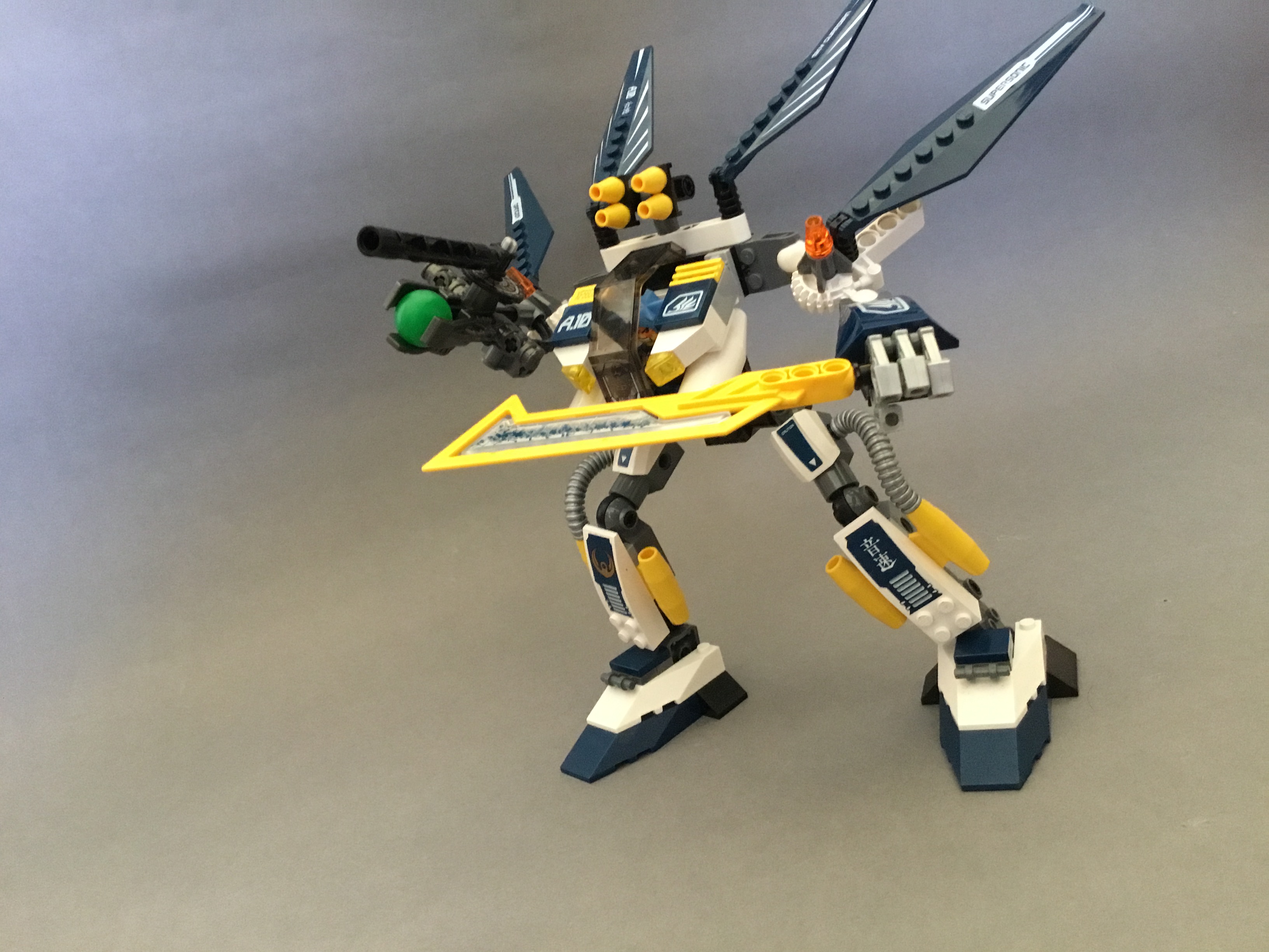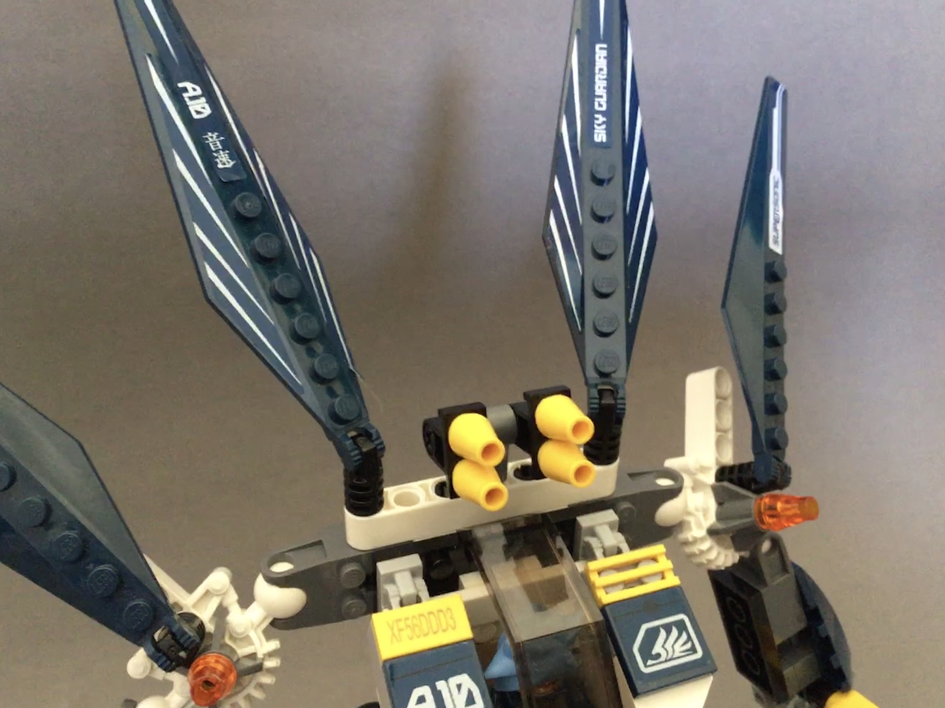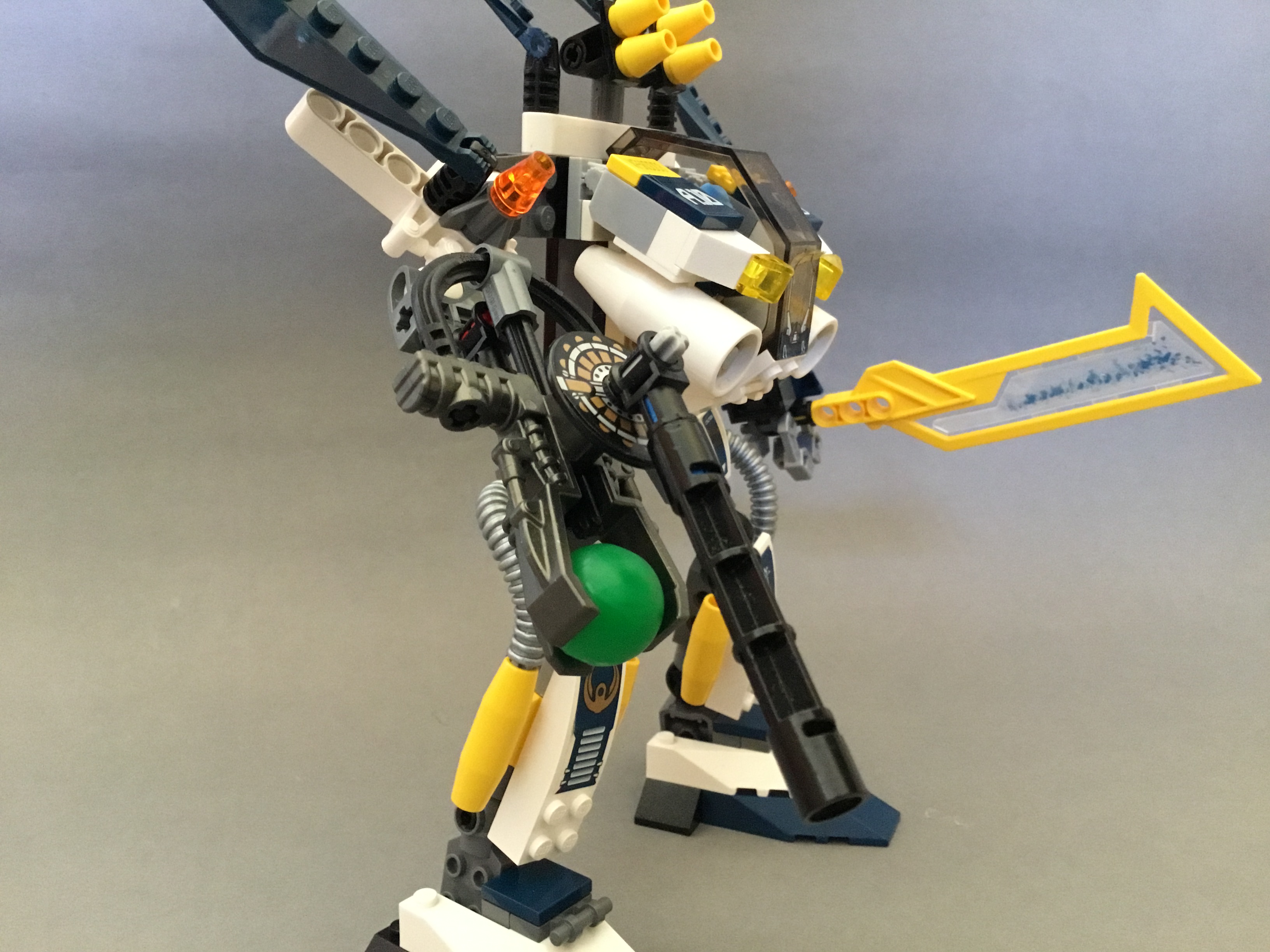 The shoulders feature a further two fins, as well as four tiny missiles on a technic construction tin the centre.