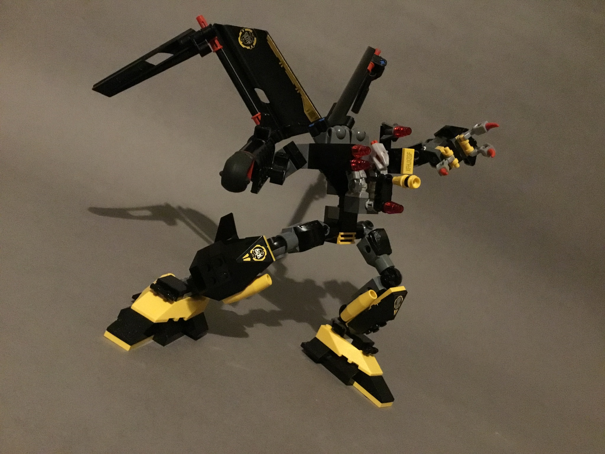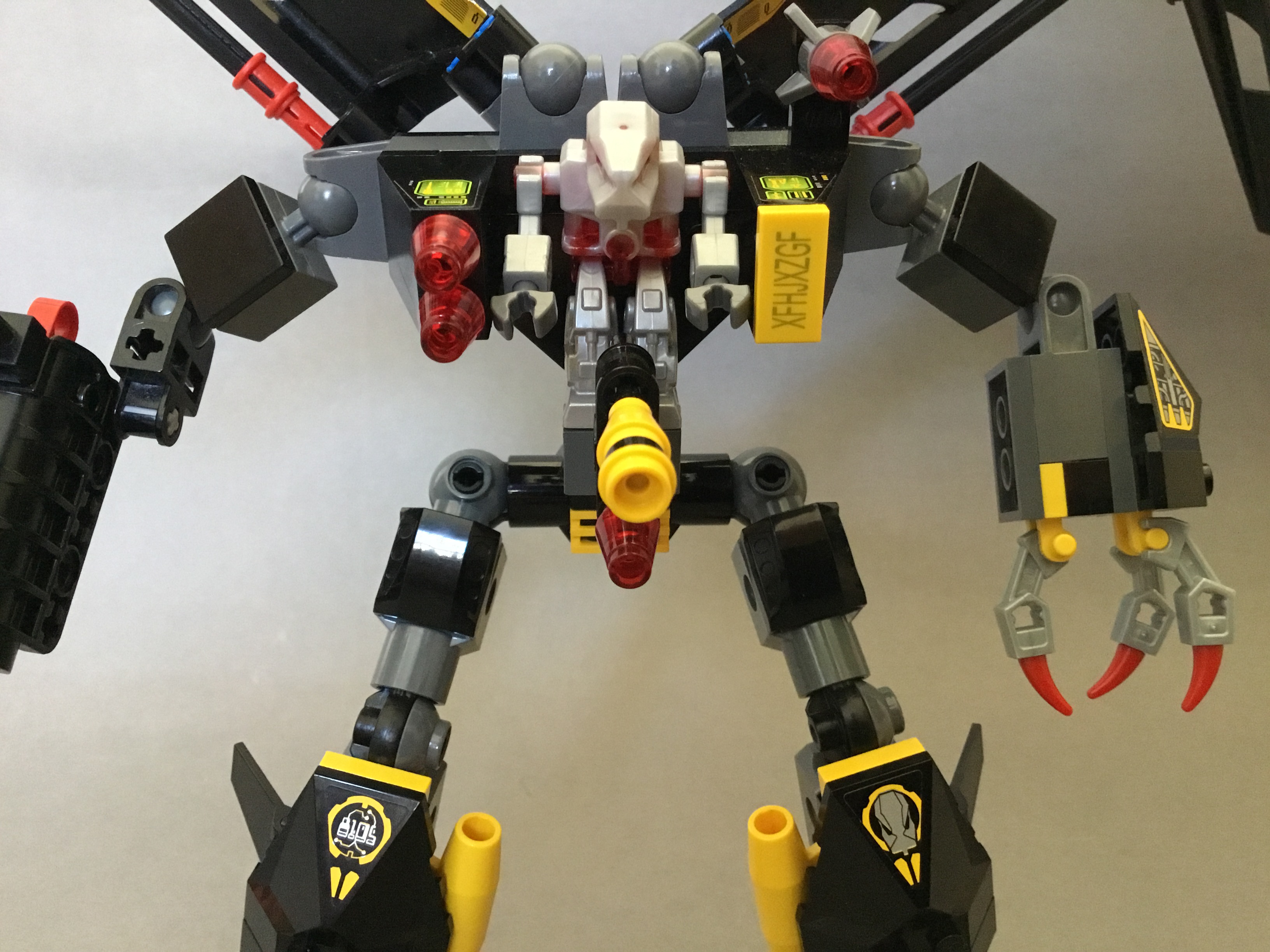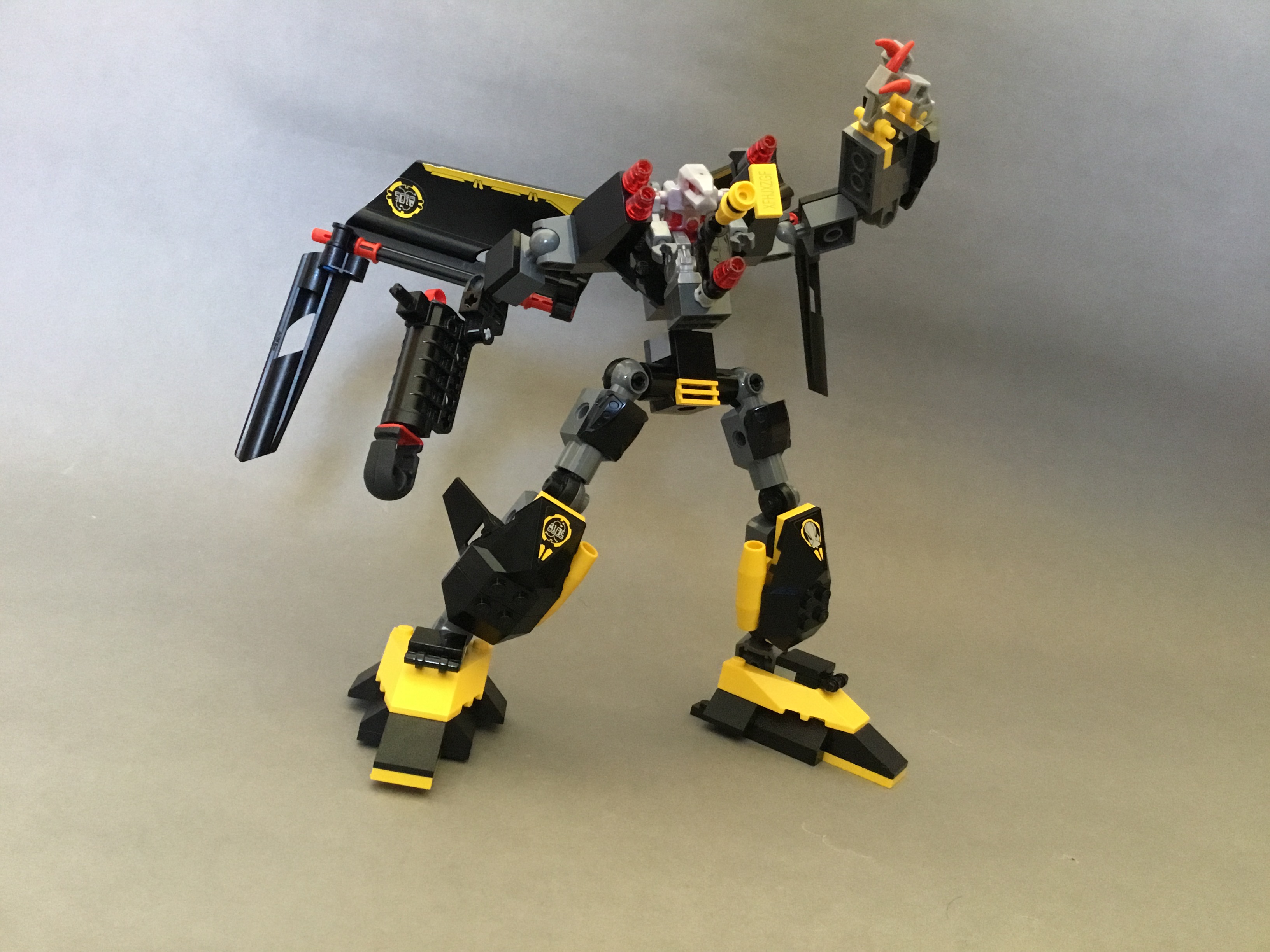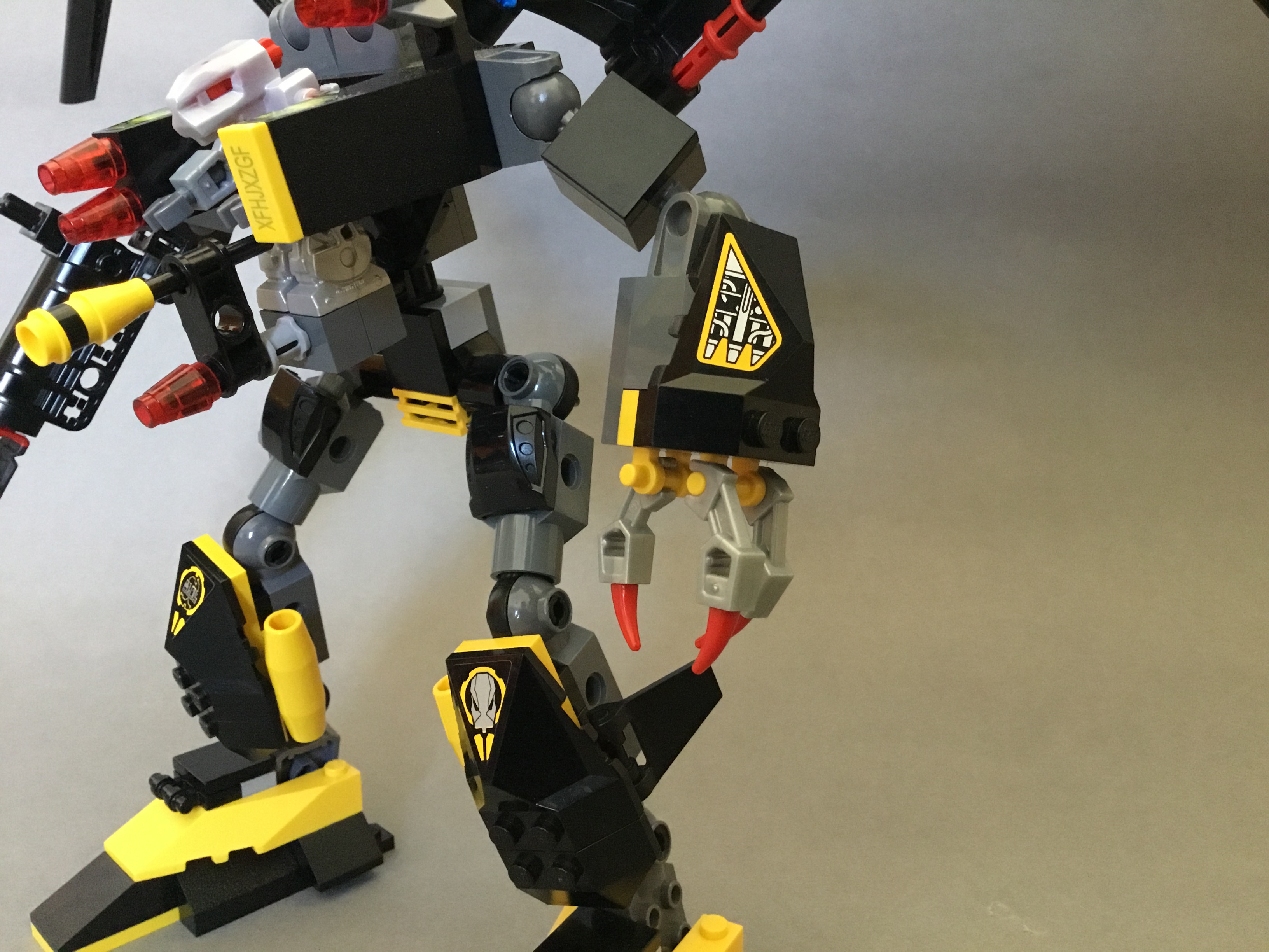 The shoulders feature a further two fins, as well as four tiny missiles on a technic construction tin the centre.