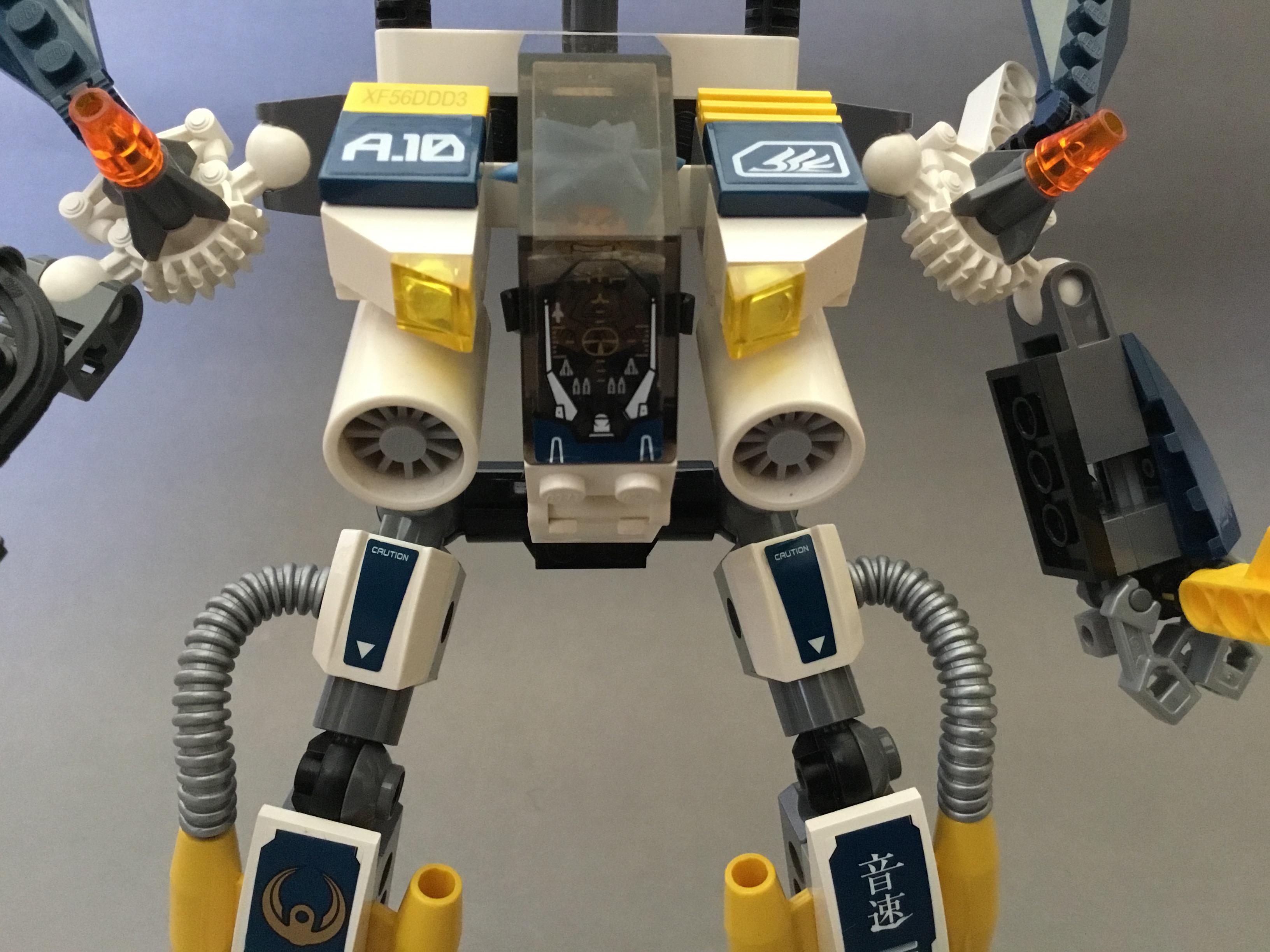 The torso shows off the new standard mid-range torso, which now allows the pilot to sit in the cockpit rather than uncomfortably stand. The interior in general is a lot more spacious, with more than enough room for the figures to move their arms, unlike the pilots of 2006 who generally had to stay flat as a pancake or risk having their arms collide with the mech’s windscreen. A pair of huge turbines reside on either side of the cockpit glass, below some headlights. The Air Force symbol adorns the left shoulder, while an ‘A.10’ appears on the right, as the counting system from last year was reset to start a ‘10’ in all categories this year, rather than continuing where the previous year left off. While the left side carries only a grille above this, the right side sports the new line-wide gimmick: Exo-Codes. These printed 1x2 tiles were all completely randomised and unique, though this aspect of them was somewhat pointless as they all unlocked the same content depending on which set you bought.
