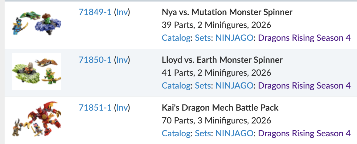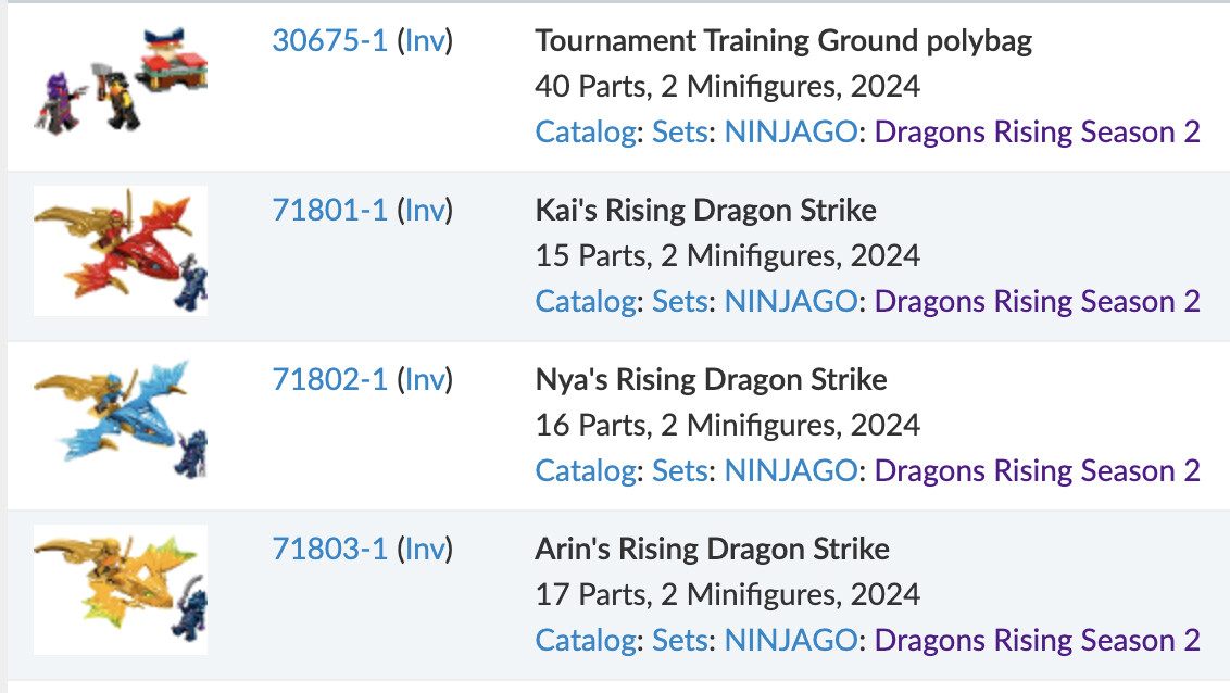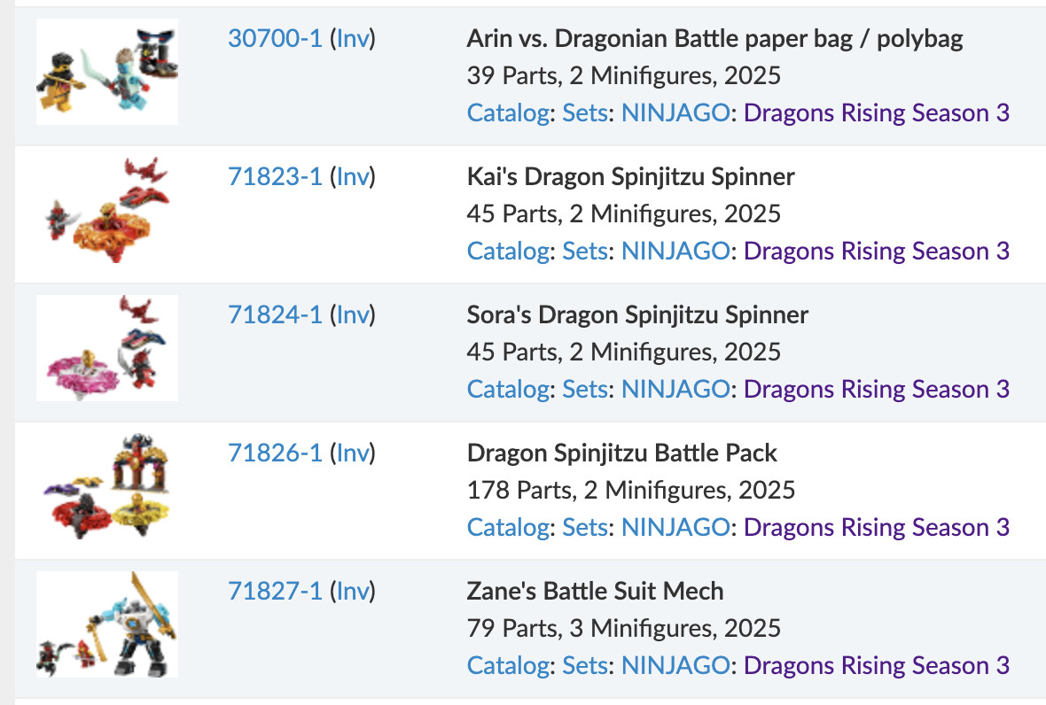 These were all released from 2024 to the present. Besides 71826, all of these are $10 or less. 30675 and the Spinners/Rising Dragon Strikes all have play features, and 71827 and 71805 include exclusive/hard-to-find figures, like Master Lloyd (otherwise exclusive to 71819), Mech Jay (exclusive to 71805), Drix (exclusive at time of release), and shirtless Zane (otherwise only found in the expensive 71837). 30700 even depicts a location that was critical to the show.