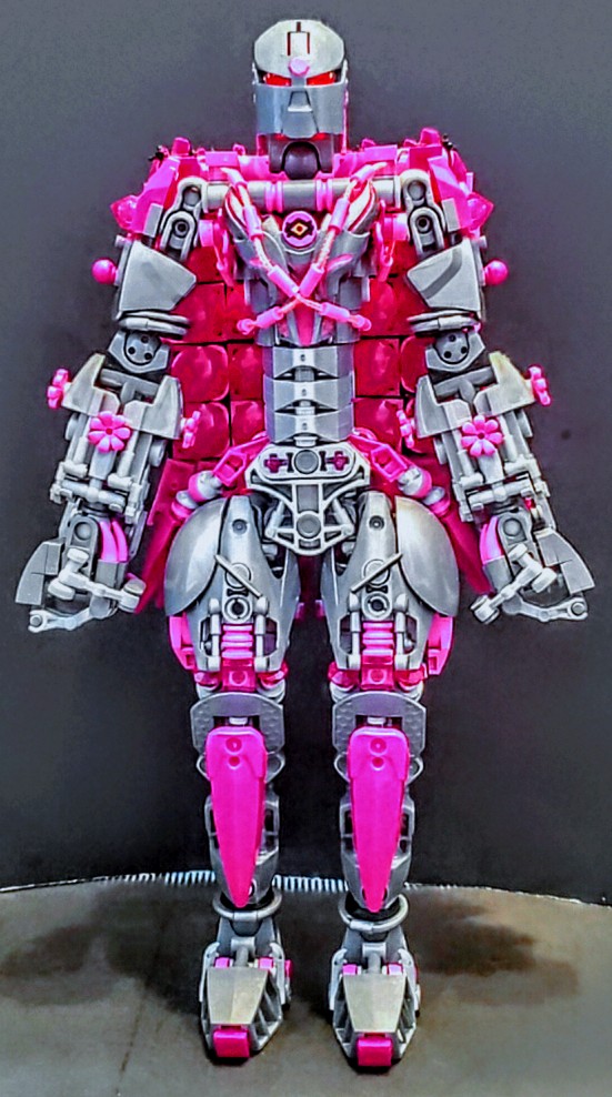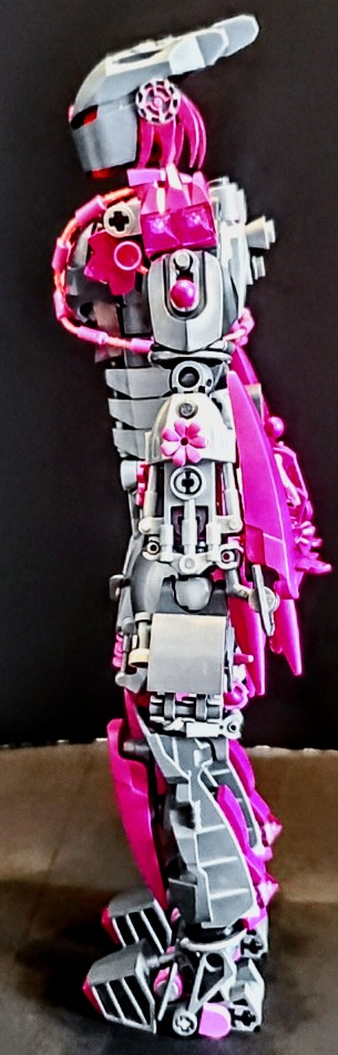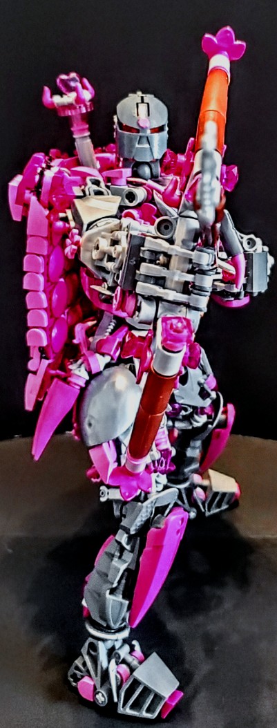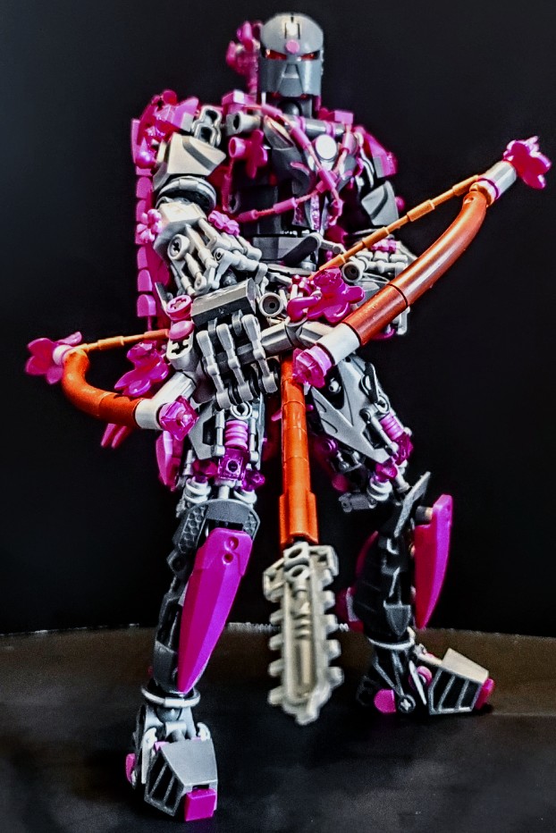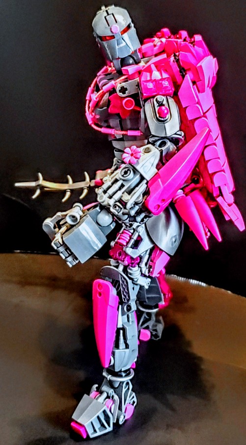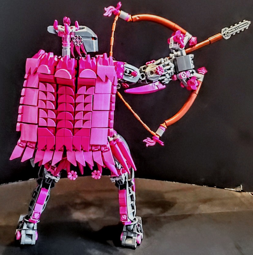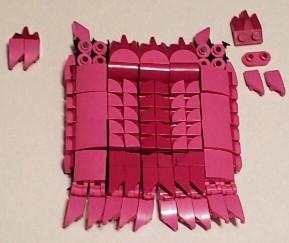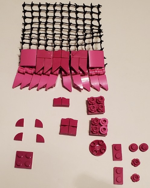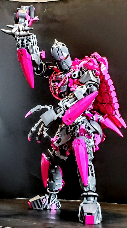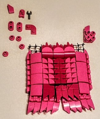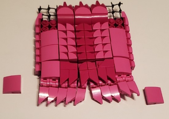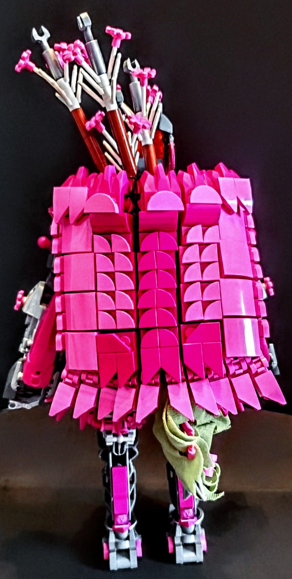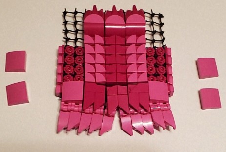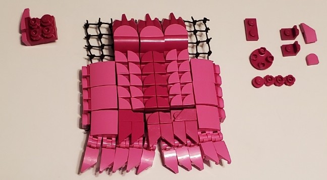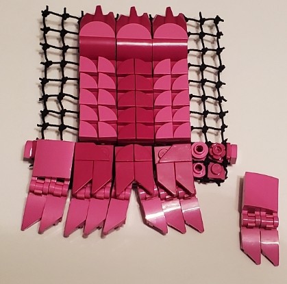 I was talking with two friend at work, on our break. I was asking my friend next to me if the was any scrap pieces of purple cloth that are used for the minifigures, which he created a lot of them, my other friend behind us overheard and gave me a great idea. She said why don’t I just build my own cape and she gave me a lego net piece, I Immediately understood what she was talking about and did just that. I used both pink aka purple for the cape, I wanted it to have a dcale like pattern, as if it where made from the hide of a long now extinct creature that now serves as an extra layer of protection.