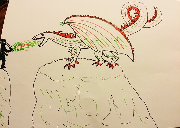 I wanted to do something a little different and have the Ninja fight the Dragon, so here we have the bloodthirsty dragon, Razor, facing off against the courageous Ninja Cole. That thing that Razor’s firing is an energy blast, if you’re wondering.