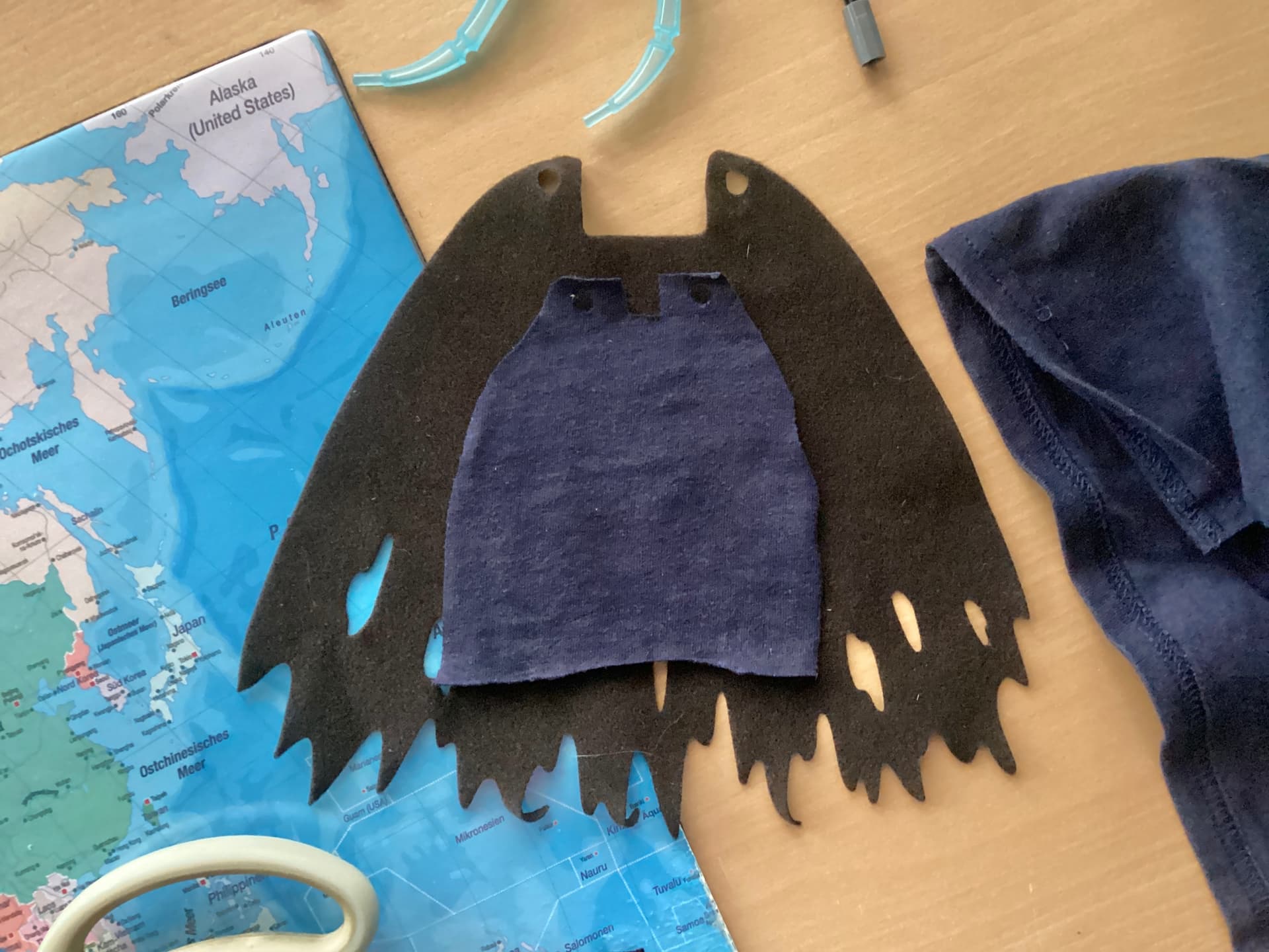 I started with a paper prototype. I then cut it out from an old T-shir t, using the paper cape as a reference.
