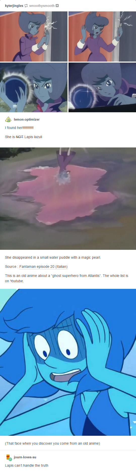 The comparison is neat, but unless Rebecca Sugar admits that Fantaman inspired Lapis’ design, I’ll assume it’s a coincidence. Imagine if SU ripped a design from anything recent. The copyright mafia would be at Ms. Sugar’s throat.