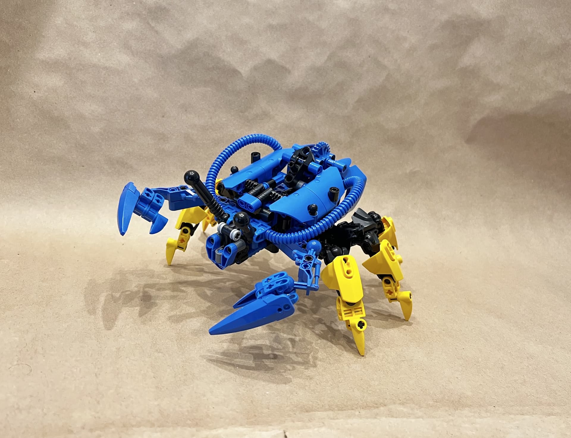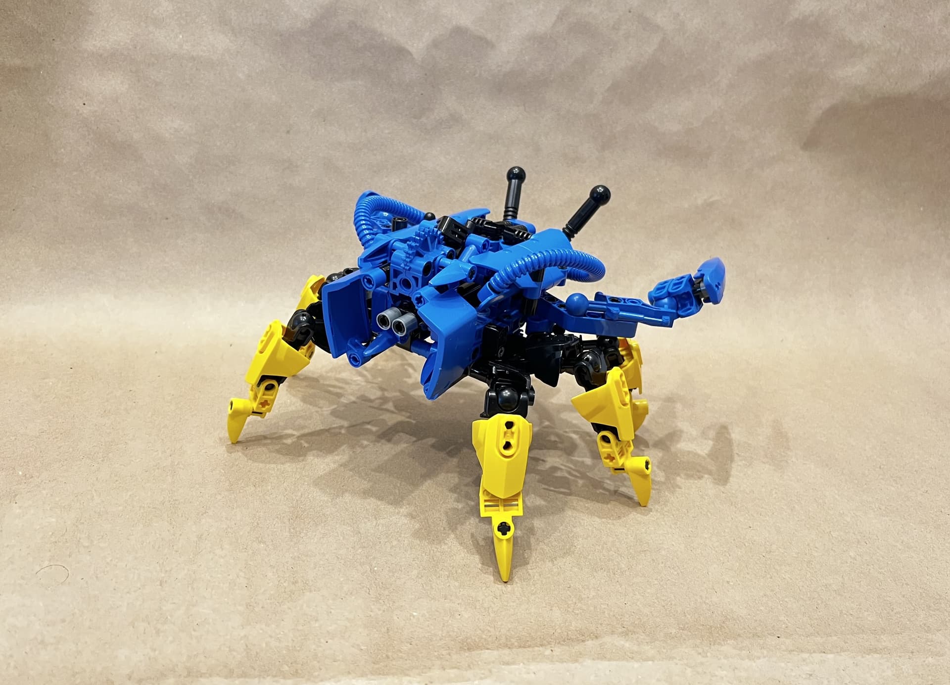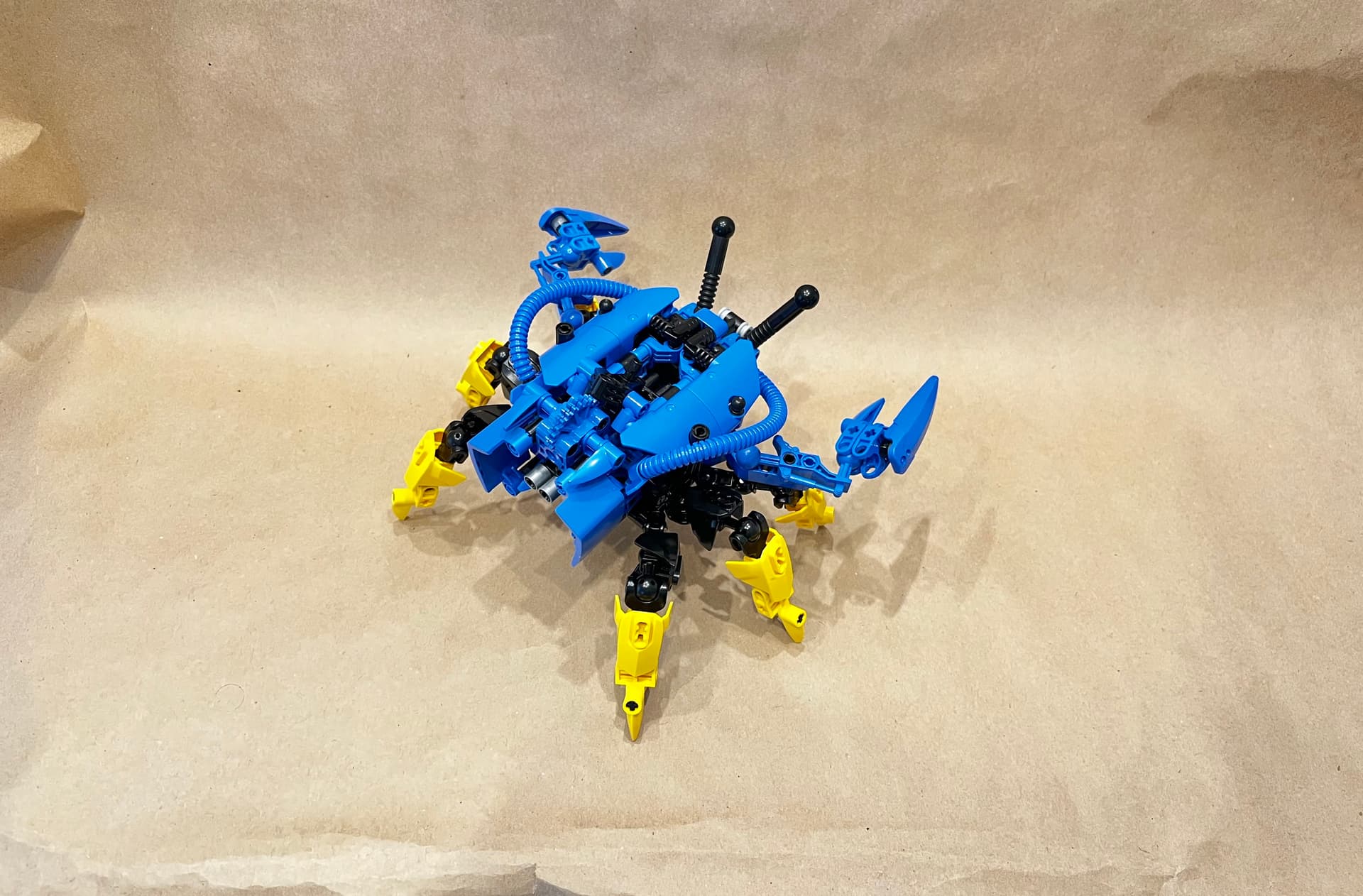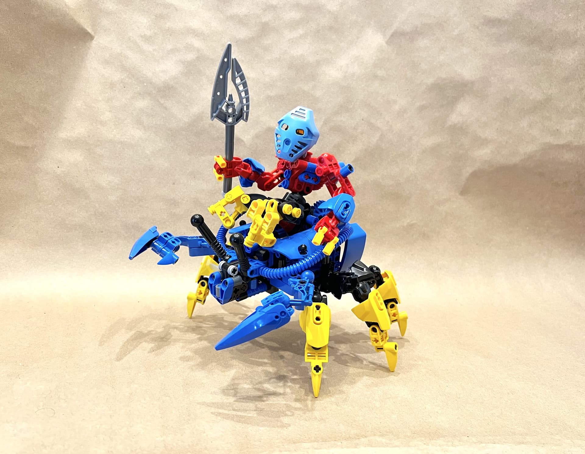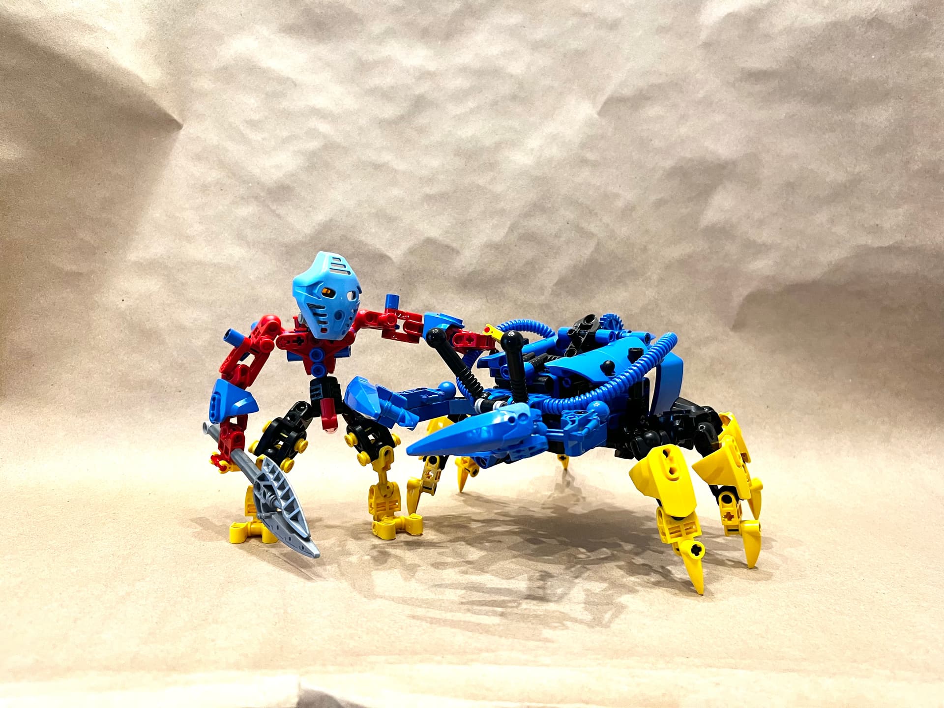 Hi everyone! This is my revamped take on Takua and his trusty steed, the Ussal crab Puku, as depicted in the 2001 MNOG. While I included a few visual cues to her 2003 set, namely the Bohrok eyes on her legs and ribbed hoses running along her shell, I drew more inspiration from her blue and yellow design as shown for the first 2 and a half years of BIONICLE.