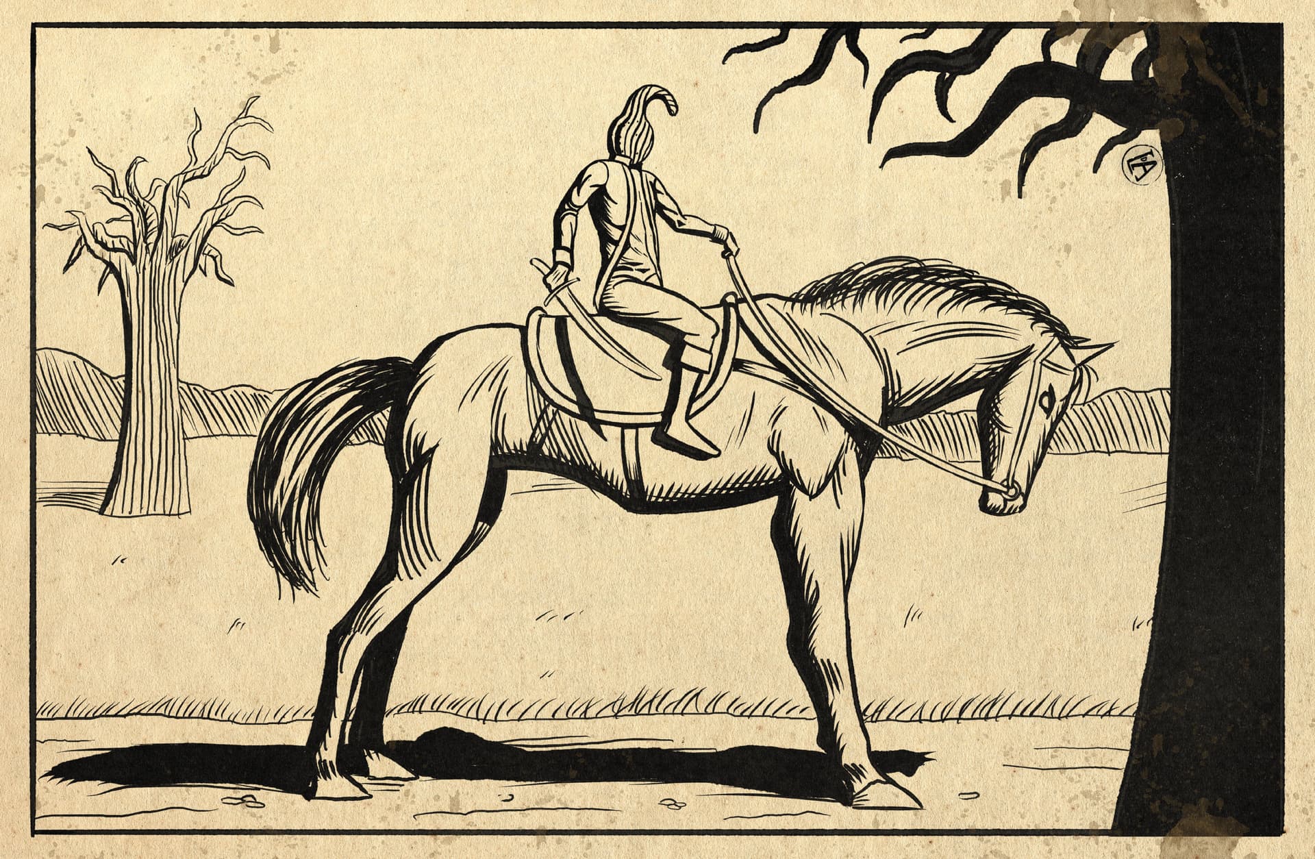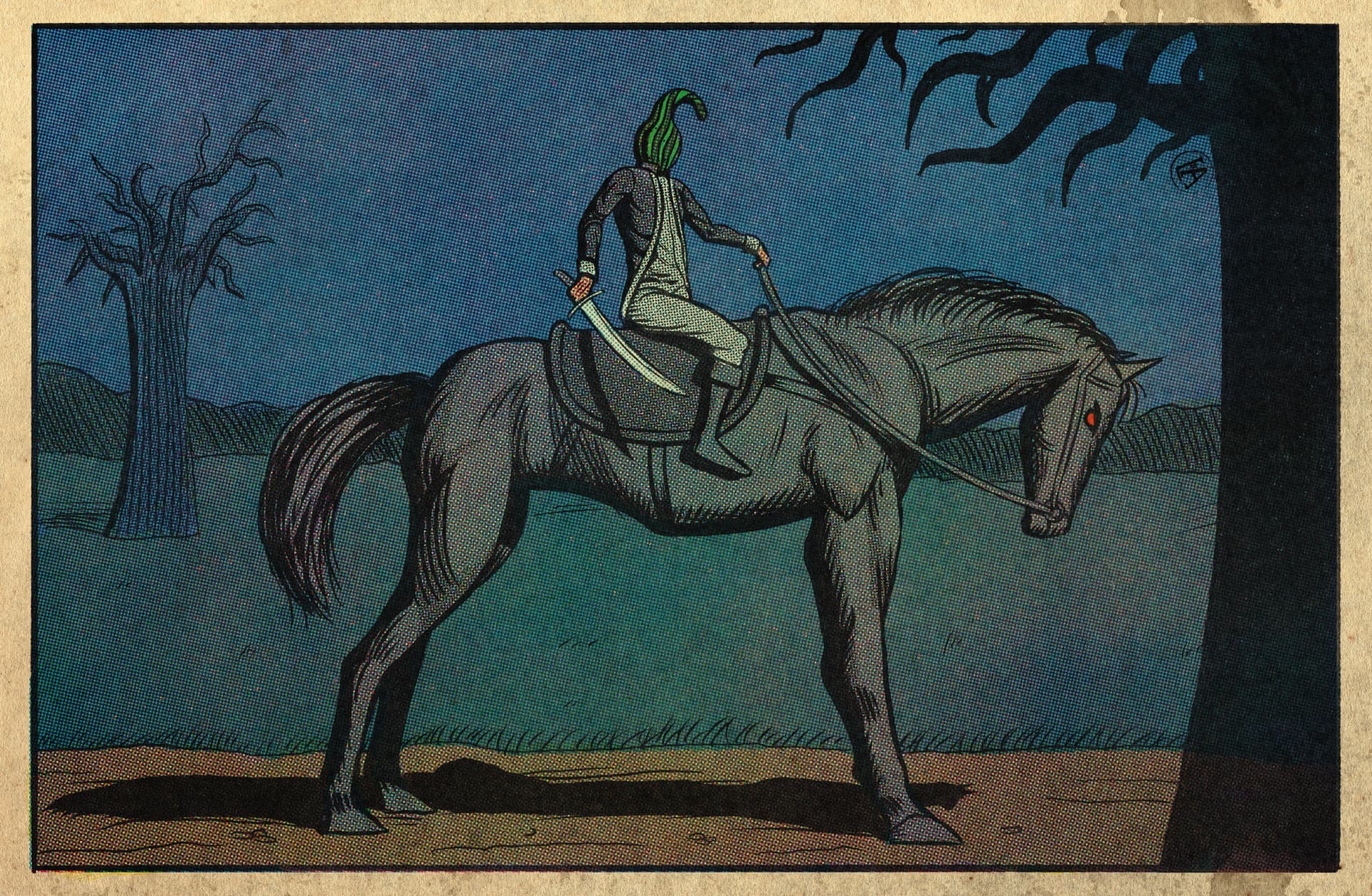 Rather spooky. But dang that horse is huge. Kinda takes away from the guy, it feels more like a monster horse with a little guy on top with a gourd for a head.