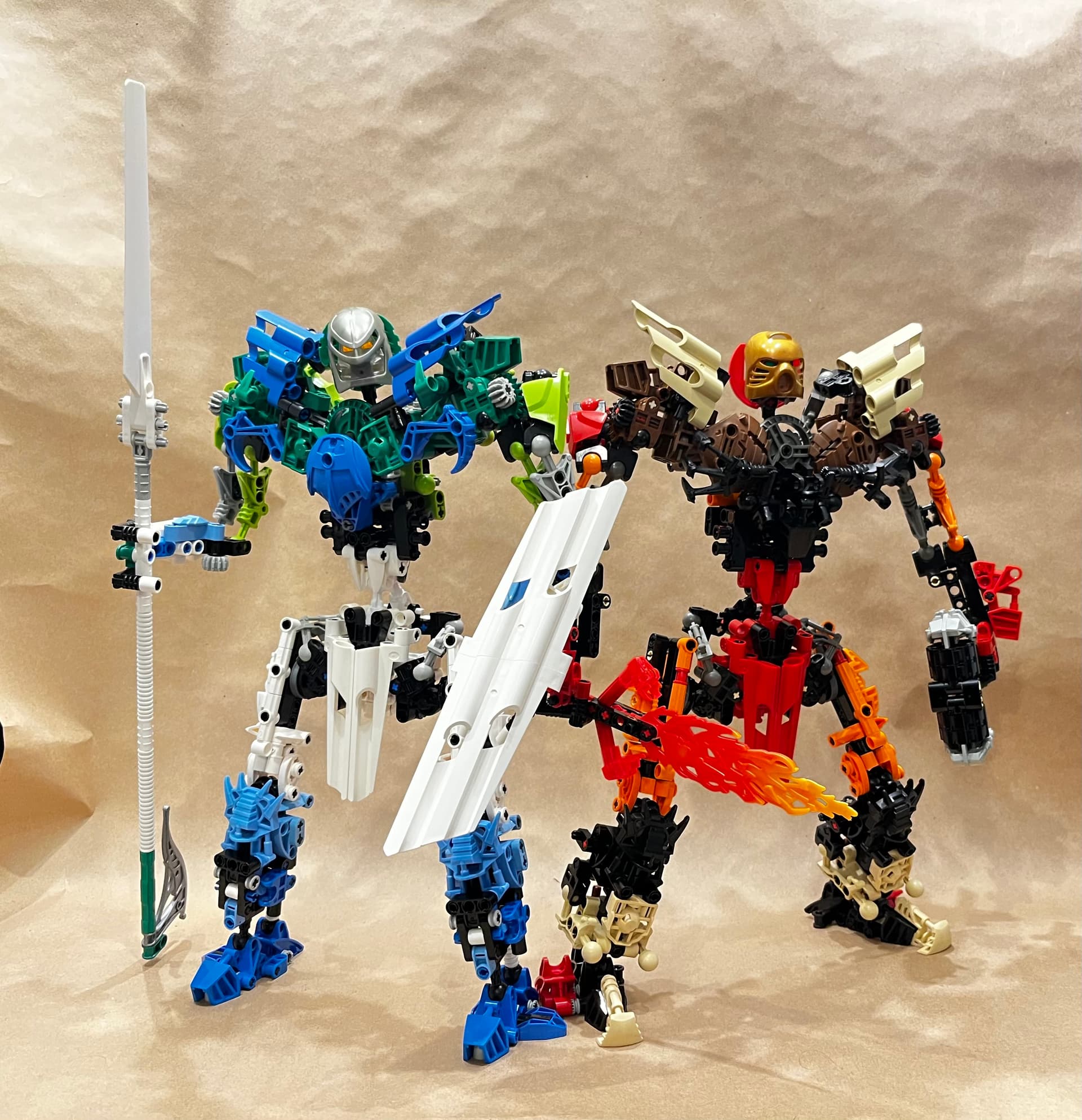 Hi everyone! My next entry in the 25th Anniversary Revamp Project of every 2001 set, I present the Toa Kaita: Akamai and Wairuha, the respective Spirits of Valor and Wisdom. The Toa Kaita are two of my favorite elements of both the story and playability of early BIONICLE, demonstrating both the importance of unity and the encouraging aspect of creating unique models. That being said, I know that the proportions are…odd. I kept that distinct look here for the most part, though I did change some of the weapons to be a bit more in line with the story (i.e. Akamai’s ‘club’).