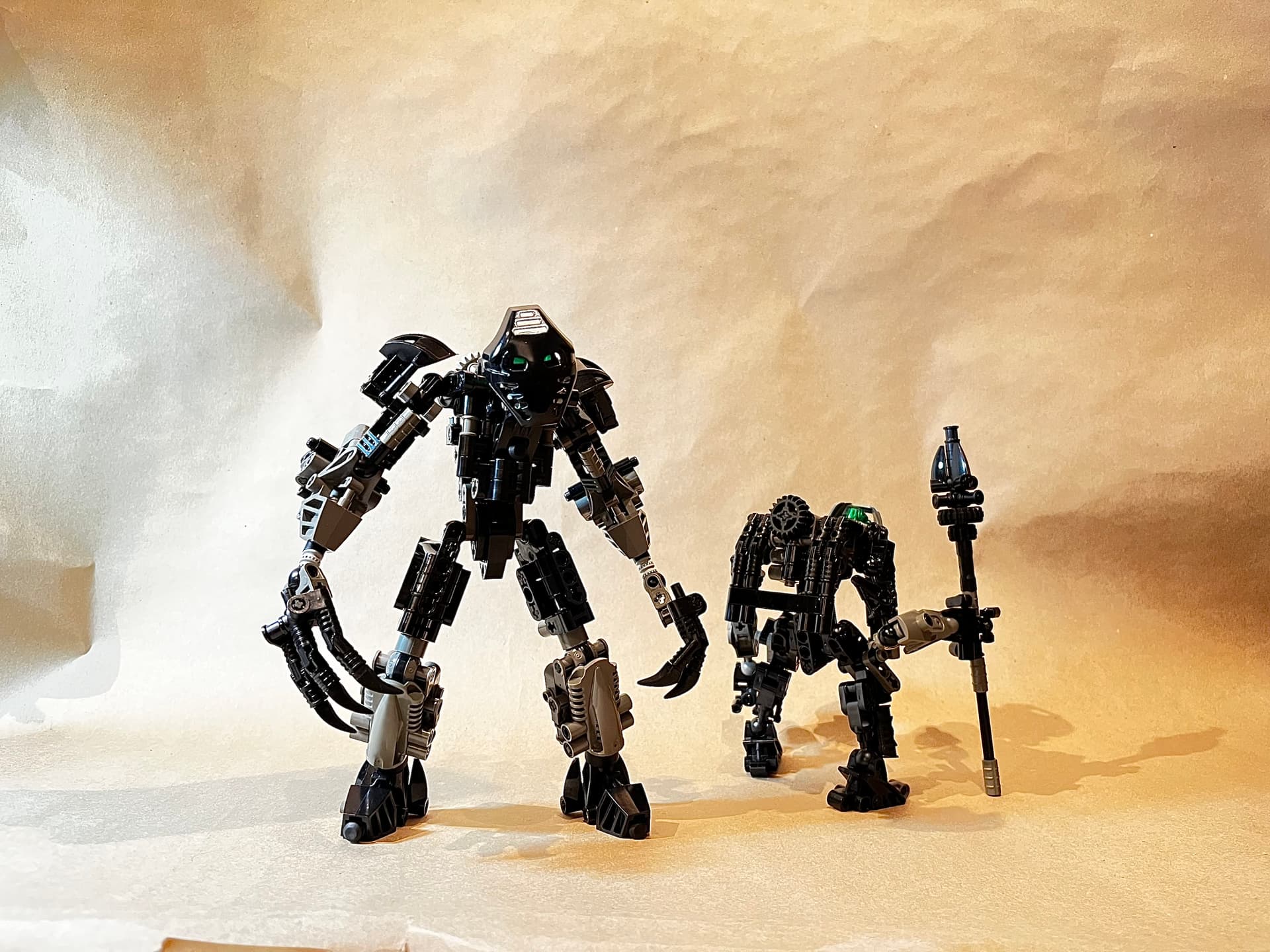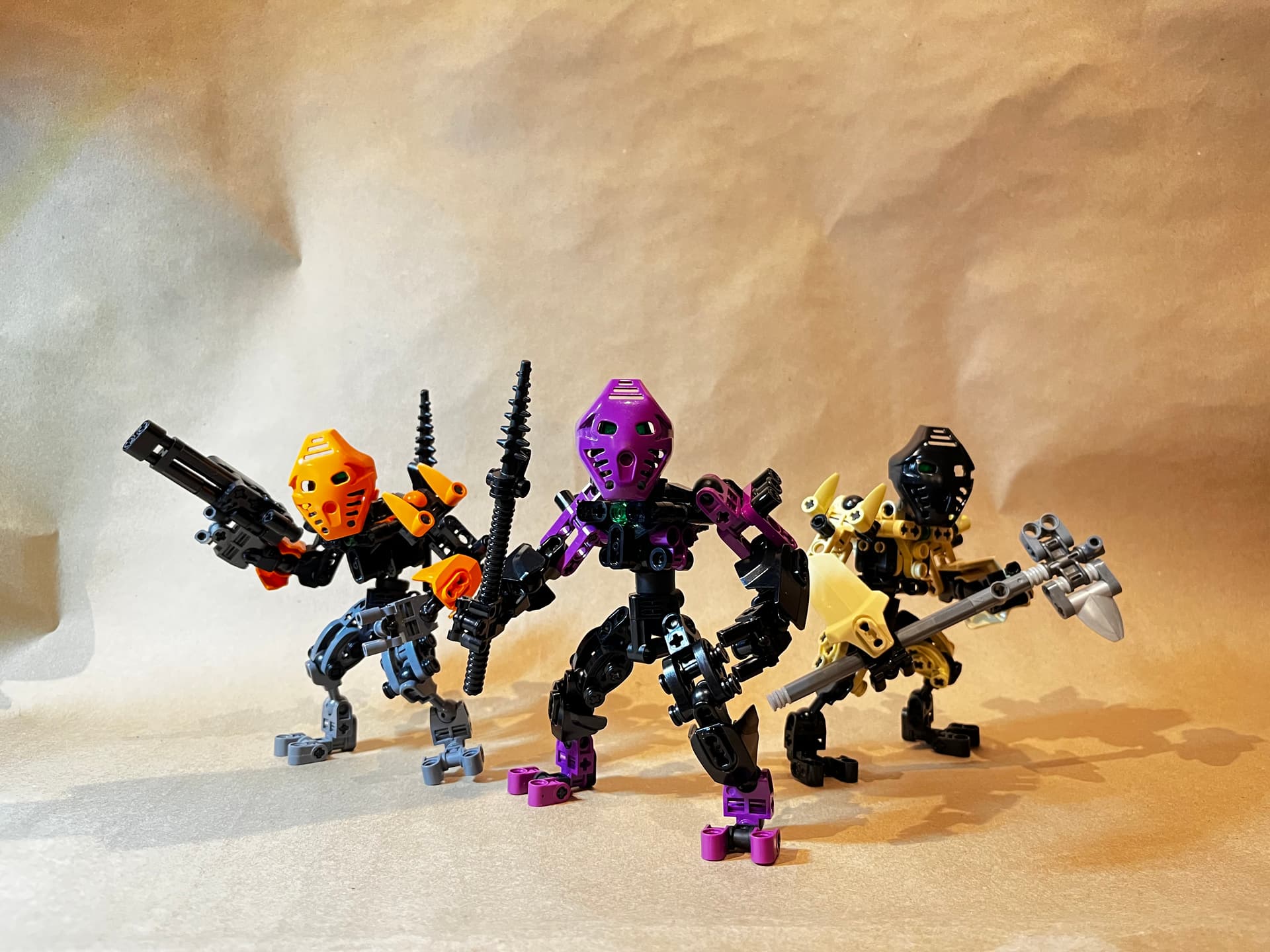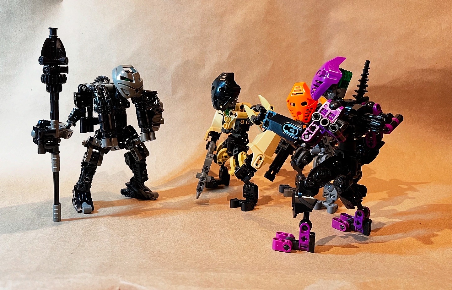 Turaga Whenua is the shortest of the Turaga, though his build is largely identical to the others. Like Onua, though, he only uses old dark grey in his design. I’m not quite satisfied with his Drill of Onua, but I’m pleased with it enough for now. Taipu and Onepu join the cadre of Matoran, and were some of the most fun to assemble. Maximizing my purple pieces for Onepu was a good challenge, and Taipu’s pickaxe might be one of my favorite tools built thus far. Though not technically part of the 2001 crew, I felt weird not doing the shoot with Nuparu, especially given how these three Onu-Matoran would have quite the monumental event together in 2002. Forgive some of the picture quality. Mostly black builds are hard to capture. Hope you enjoy them nonetheless!