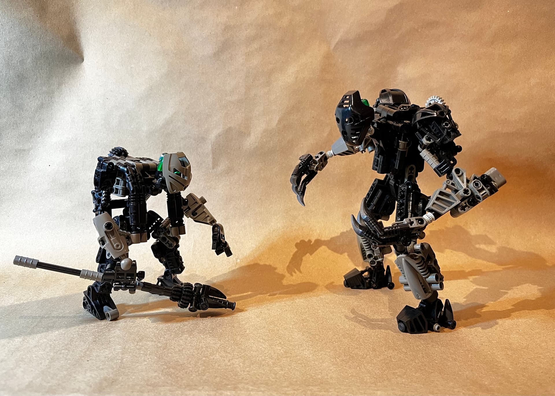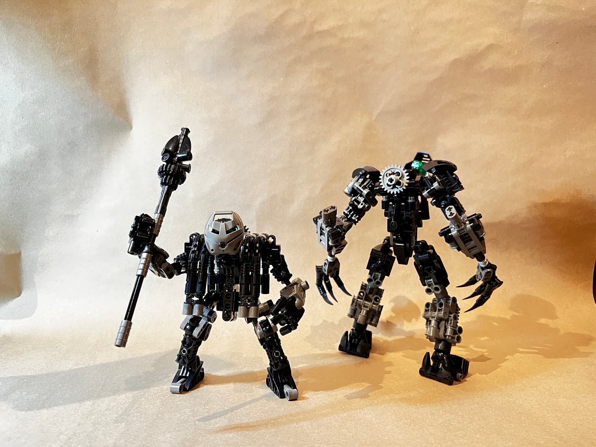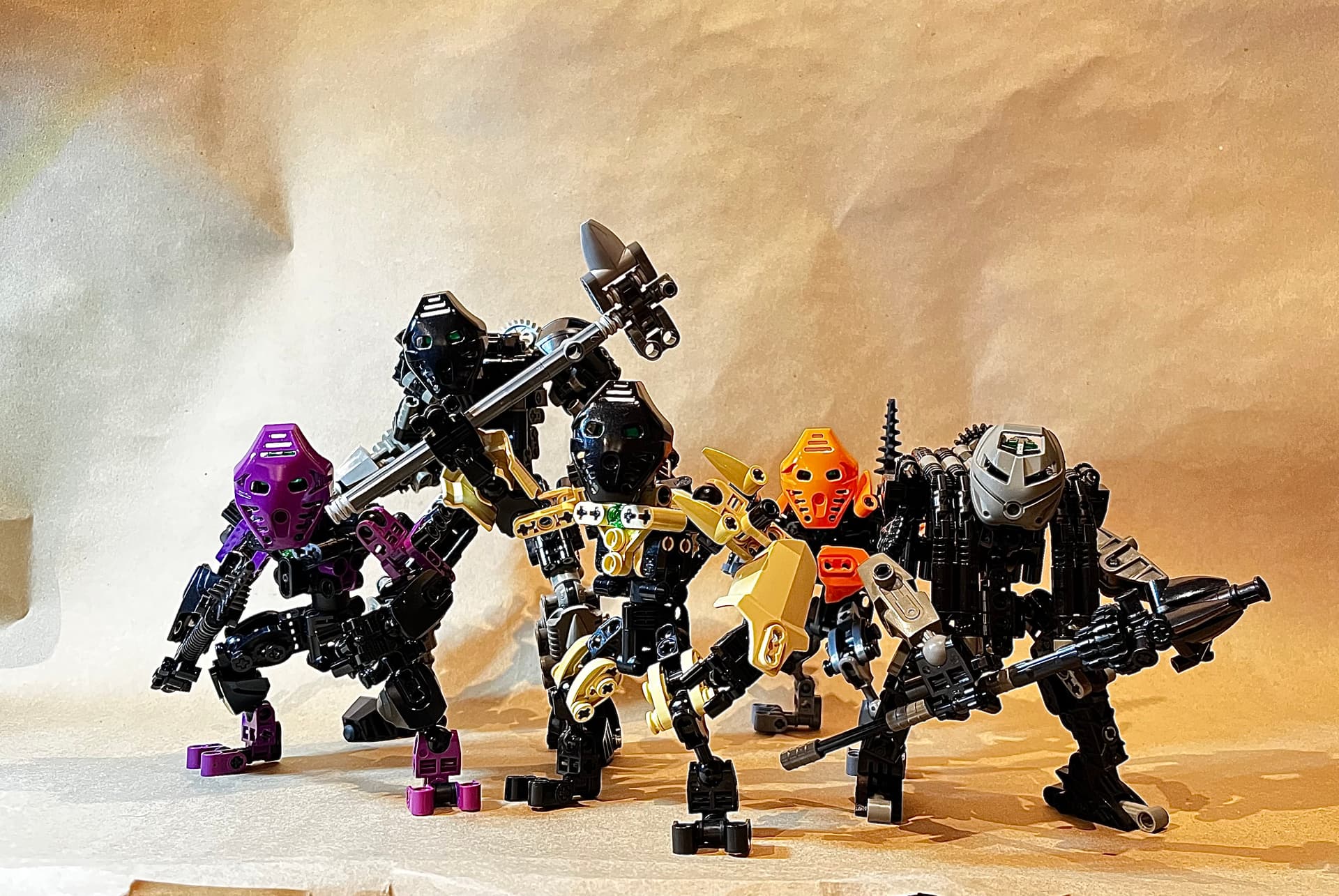 Turaga Whenua is the shortest of the Turaga, though his build is largely identical to the others. Like Onua, though, he only uses old dark grey in his design. I’m not quite satisfied with his Drill of Onua, but I’m pleased with it enough for now. Taipu and Onepu join the cadre of Matoran, and were some of the most fun to assemble. Maximizing my purple pieces for Onepu was a good challenge, and Taipu’s pickaxe might be one of my favorite tools built thus far. Though not technically part of the 2001 crew, I felt weird not doing the shoot with Nuparu, especially given how these three Onu-Matoran would have quite the monumental event together in 2002. Forgive some of the picture quality. Mostly black builds are hard to capture. Hope you enjoy them nonetheless!