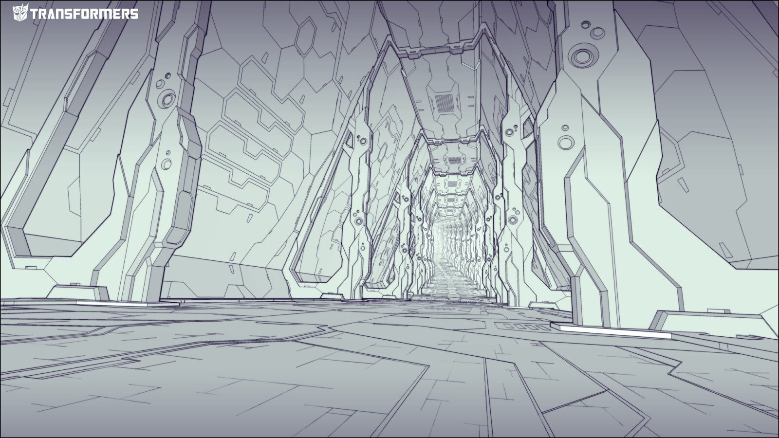 The doorway led into a long hallway with slanted, detailed walls. Light fixtures in the ceiling illuminate the corridor with a soft, blue-white glow.
