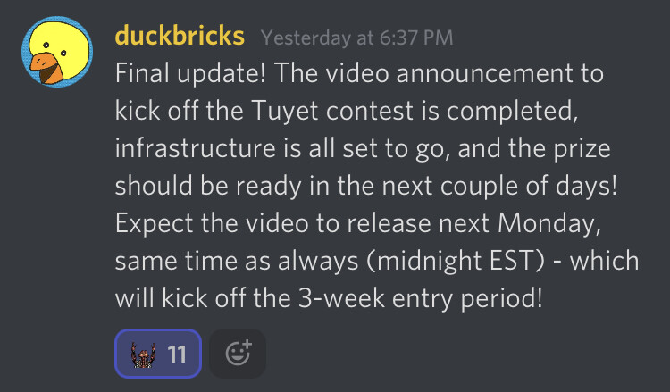 Ah excuse me, I should’ve elaborated. Here’s the exact announcement he made on discord; he hasn’t posted the video to his channel yet because it’s going to kick off the contests, the video and the contests both start midnight on next Monday (the 18th). It’s gonna be exciting to see your entry there, bro!